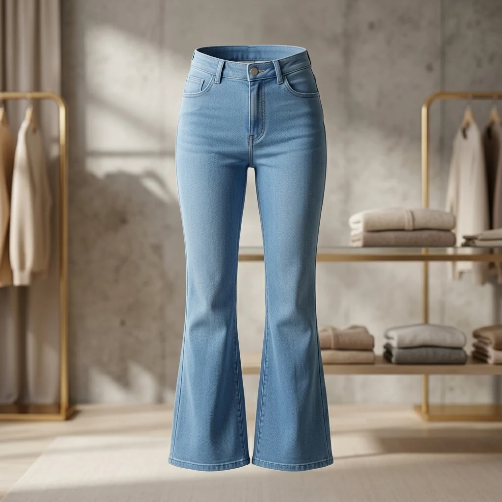 Discover the perfect blend of nostalgic style and modern comfort with our high-rise flared jeans. These jeans are meticulously designed to hug the waist and hips before opening into a bold, expressive flare at the hem. The light blue wash offers a clean, refreshed aesthetic that pairs effortlessly with everything from tucked-in tees to crisp linen blouses.