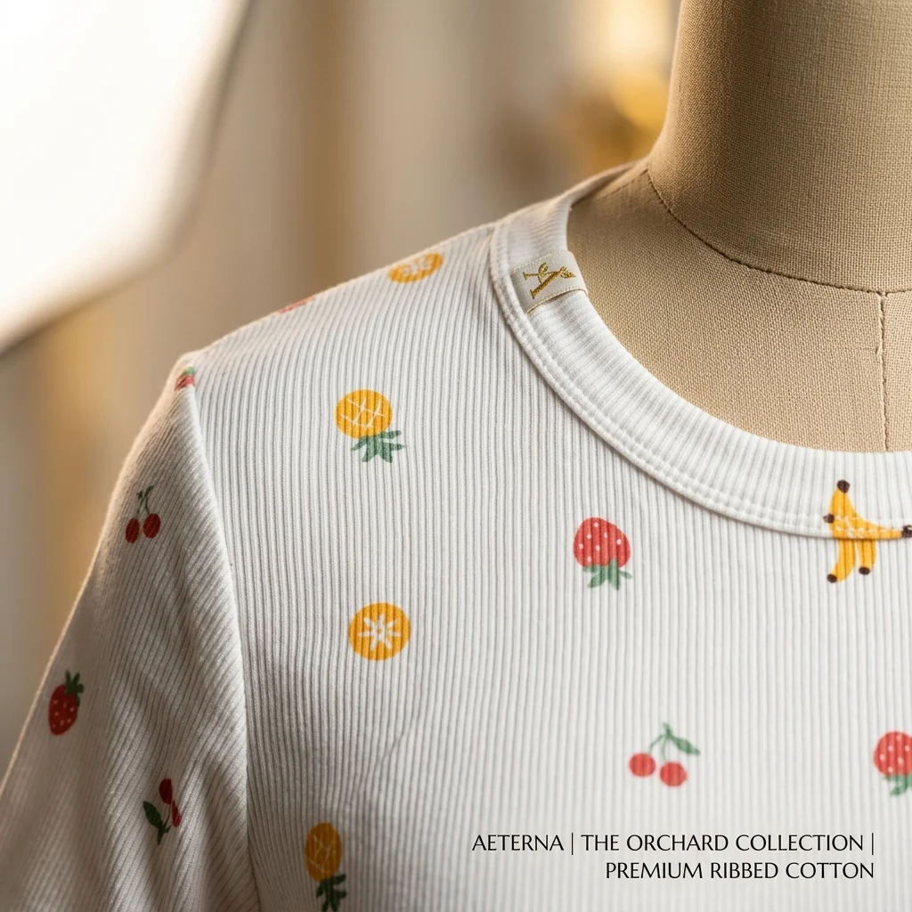 Embrace the sweetness of leisure with the Aeterna Orchard Collection. This two-piece set is designed for the modern woman who values both whimsical style and uncompromising comfort. The ensemble features an all-over botanical print of vibrant fruits, set against a crisp white backdrop that evokes the freshness of a summer morning.