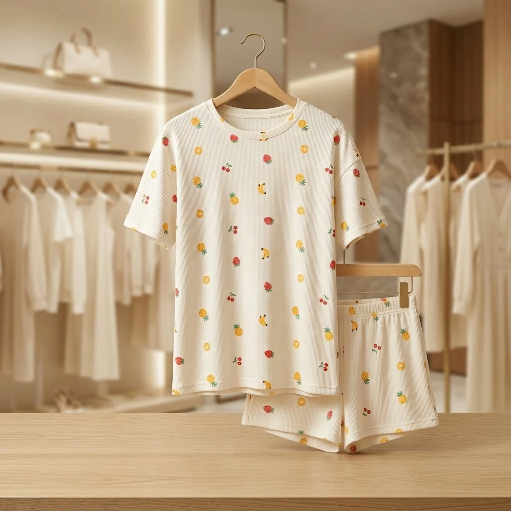 Feature Details SKU Id 70005220260314 Category Women’s Apparel Gender Women Product Type Two-Piece Set (T-shirt & Shorts) Fabric Premium Ribbed Cotton Fit Type Relaxed Fit Sleeve Type Short Sleeves Neckline Crew Neck Length Mid-thigh (Shorts); Regular Hip Length (Top) Pattern / Print Orchard / Fruit All-Over Print Occasion Loungewear, Casual Wear, Summer Outing Season Spring/Summer Care Instructions Gentle machine wash; cold water recommended; do not bleach.