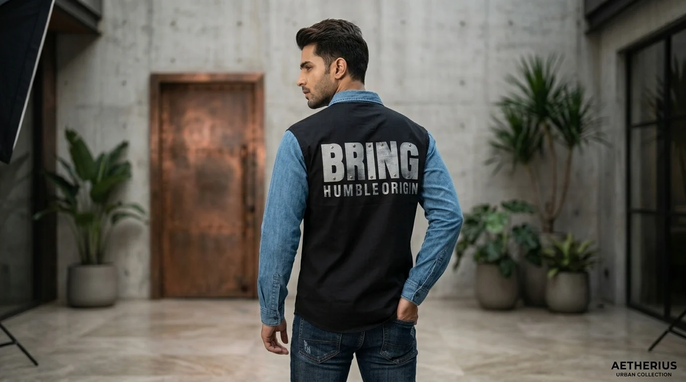 Home » Shop » Aetherius Men’s Contrast Denim-Sleeve Black Urban Shirt