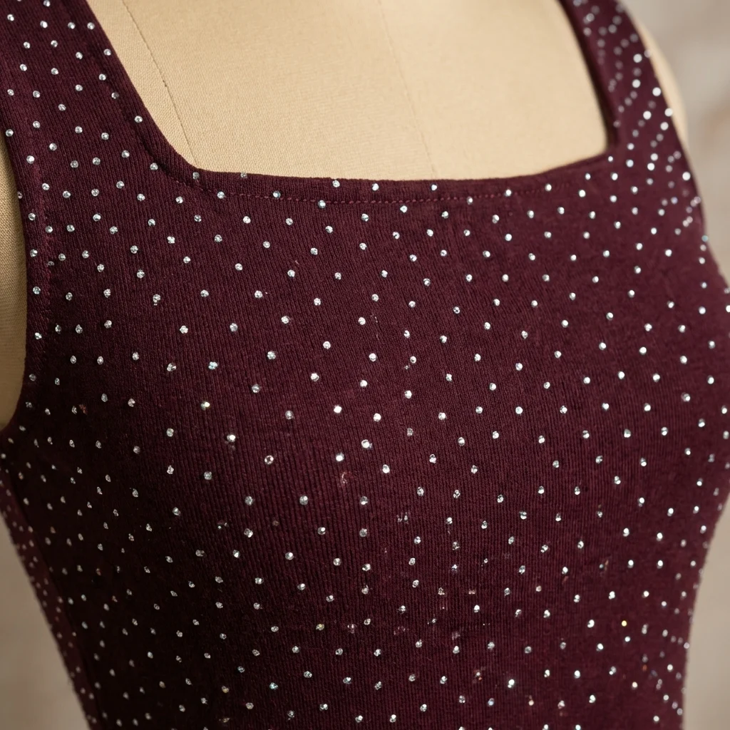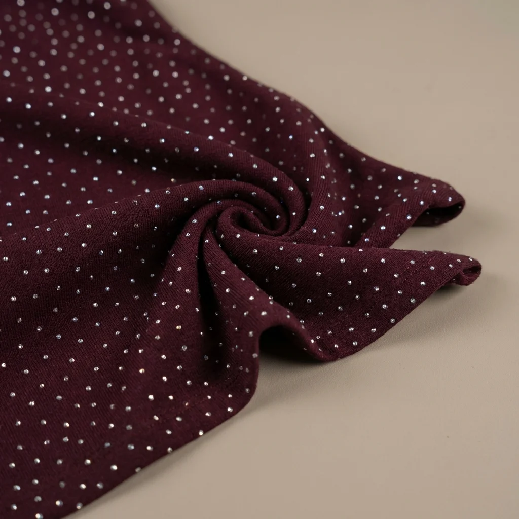 Step into the spotlight with a piece designed for effortless evening elegance. This bodysuit is crafted from a rich burgundy knit fabric that offers both comfort and a structured, body-hugging fit. The deep wine hue provides a sophisticated canvas for the meticulously placed silver rhinestones, creating a subtle yet captivating shimmer.