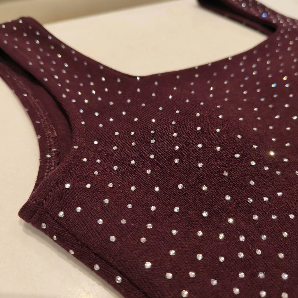 Embellishment: Heat-set silver rhinestones in a uniform pattern.