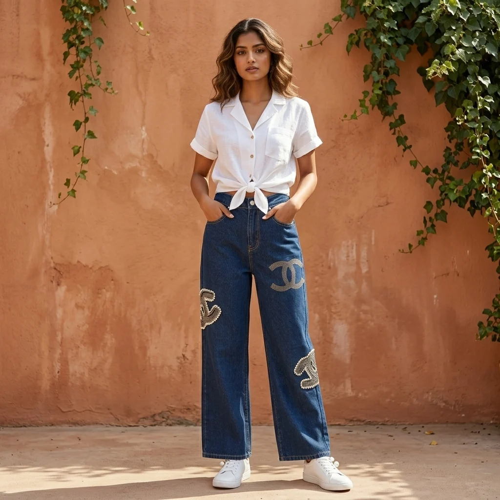 Home » Shop » Chanel Embellished High-Waisted Wide-Leg Jeans