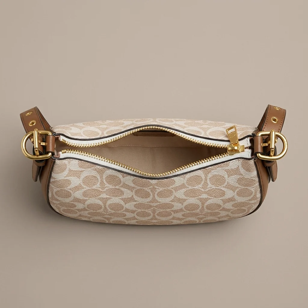 The Coach Mira Shoulder Bag is a masterclass in functional luxury. Its exterior is crafted from durable signature coated canvas, accented by rich saddle-brown leather piping that defines its graceful, curved edges. The structured bottom allows the bag to maintain its shape while resting, making it as practical as it is stylish.