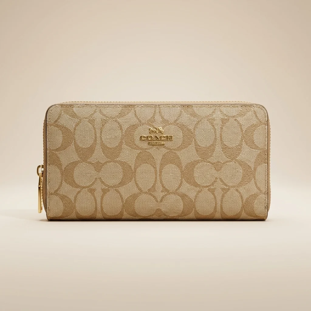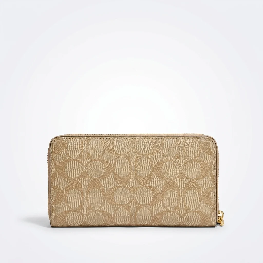 Experience the perfect blend of luxury and utility with this Coach Signature Zip-Around Wallet. The exterior is constructed from durable coated canvas, adorned with the legendary “C” motif that defines timeless American fashion. Its neutral tan tones are beautifully complemented by polished gold-tone metal accents, including a prominent Coach horse and carriage emblem.