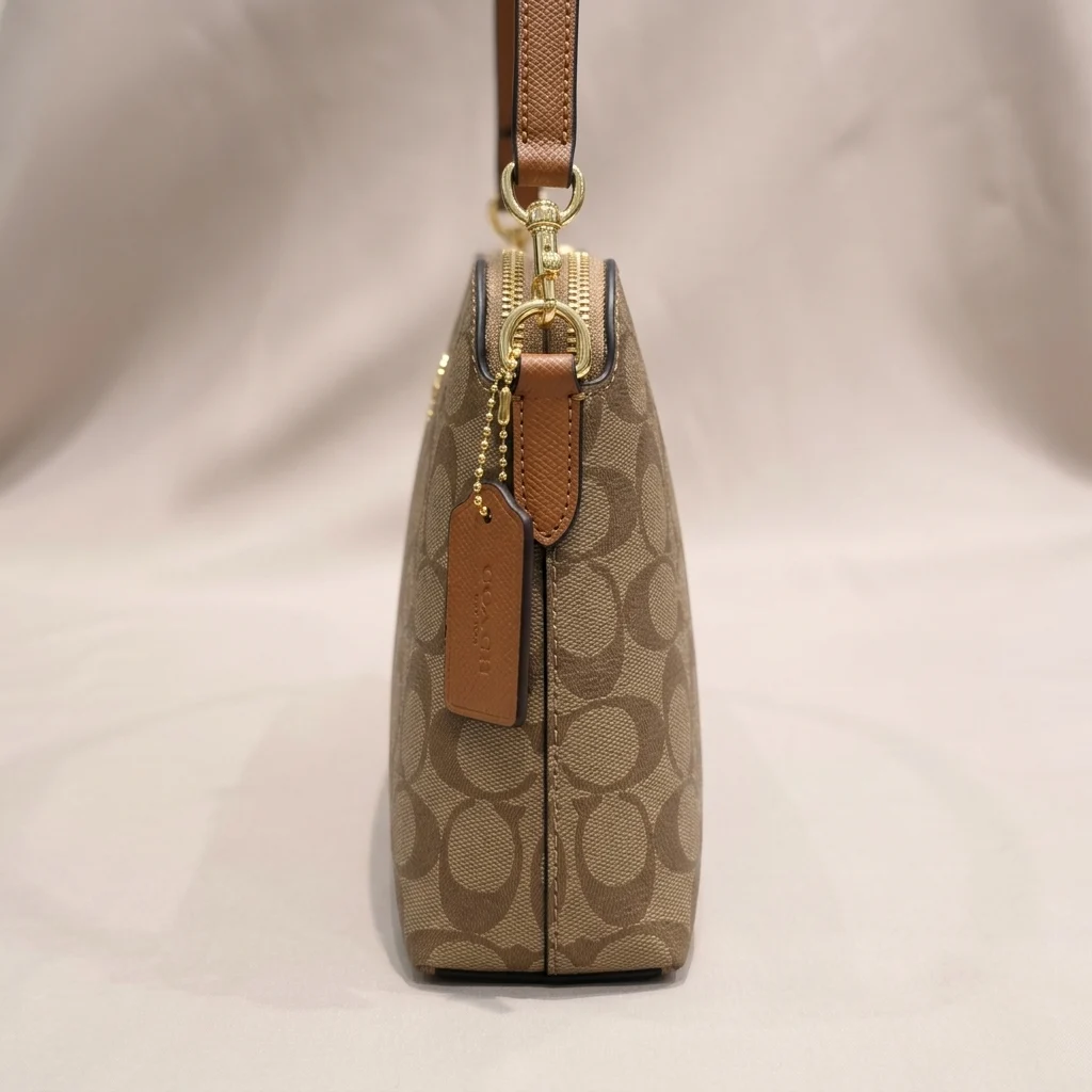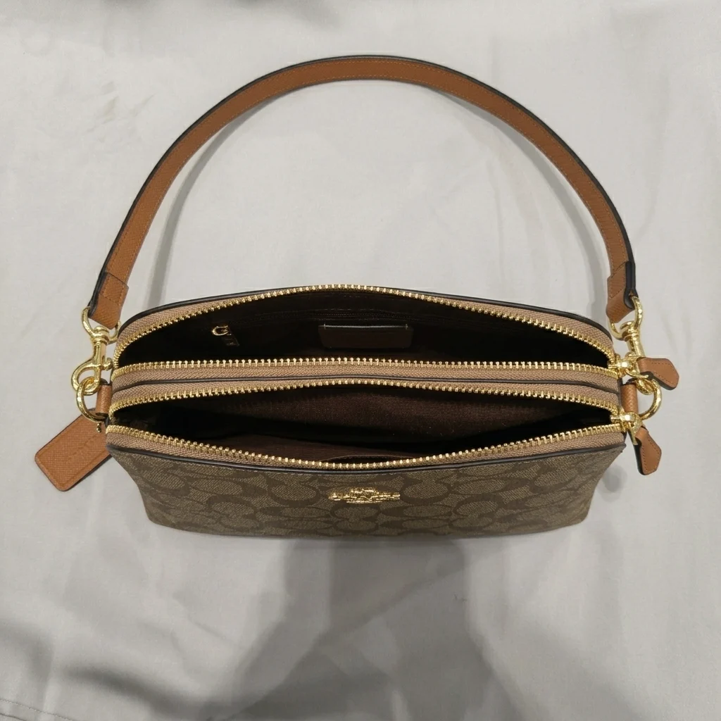 Functionality is at the heart of this design. Unlike standard small bags, this model offers multiple storage zones, including two independent zippered sections and a center slip area. The polished gold-tone hardware and the signature metal Coach logo on the front provide a high-end finish that catches the light beautifully, making it a reliable staple for any well-curated wardrobe.