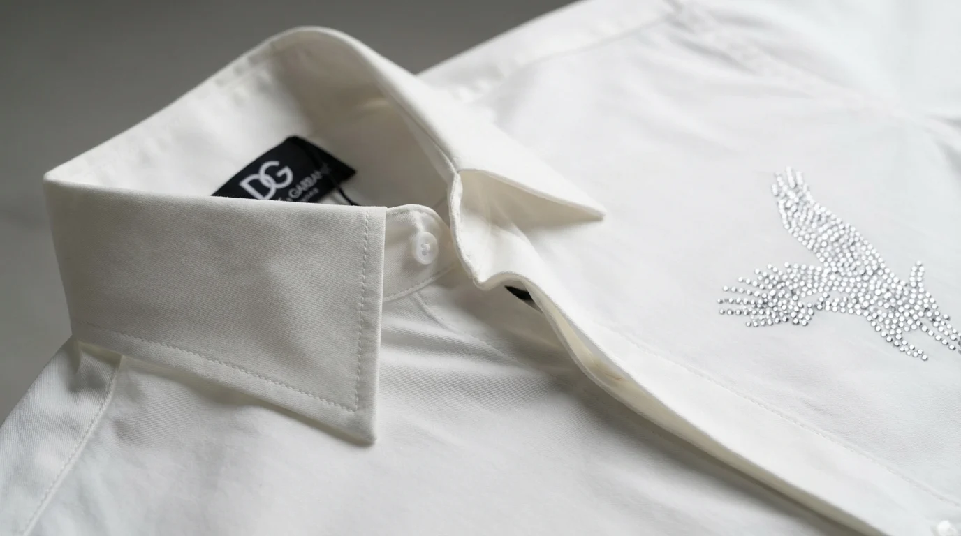 Redefine evening elegance with the Dolce & Gabbana Crystal Eagle Embellished Shirt. This masterpiece showcases the brand’s commitment to opulent design, featuring a majestic eagle silhouette rendered in shimmering silver crystals. The embellishment is strategically placed on the left chest and echoed in a larger, dramatic scale across the back, ensuring you make an unforgettable impression from every angle.
