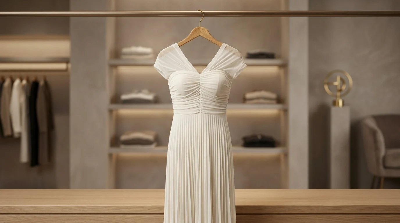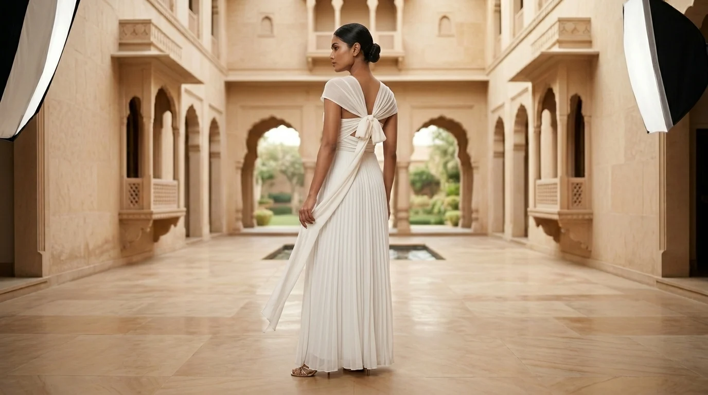 • Timeless Sophistication: A masterful blend of classic Grecian-inspired pleats and contemporary sheer detailing.