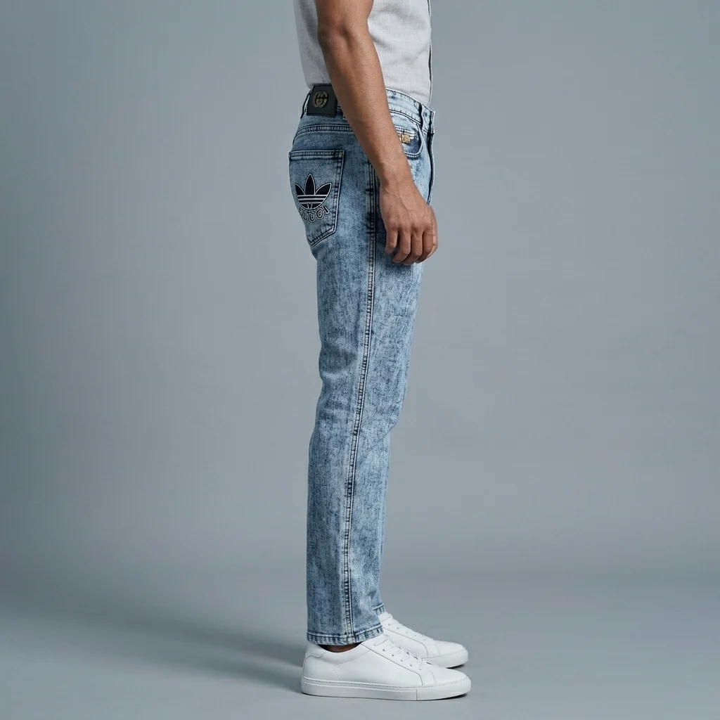 Elevate your casual rotation with these Men’s Acid Wash Denim Jeans. Designed for the modern man who appreciates high-fashion details, these jeans feature a unique light blue marble texture achieved through a specialized stone-washing process. The gold-tone “Gucci” embossed button and branded hardware provide a luxurious contrast against the cool-toned denim, making them a centerpiece for any outfit.