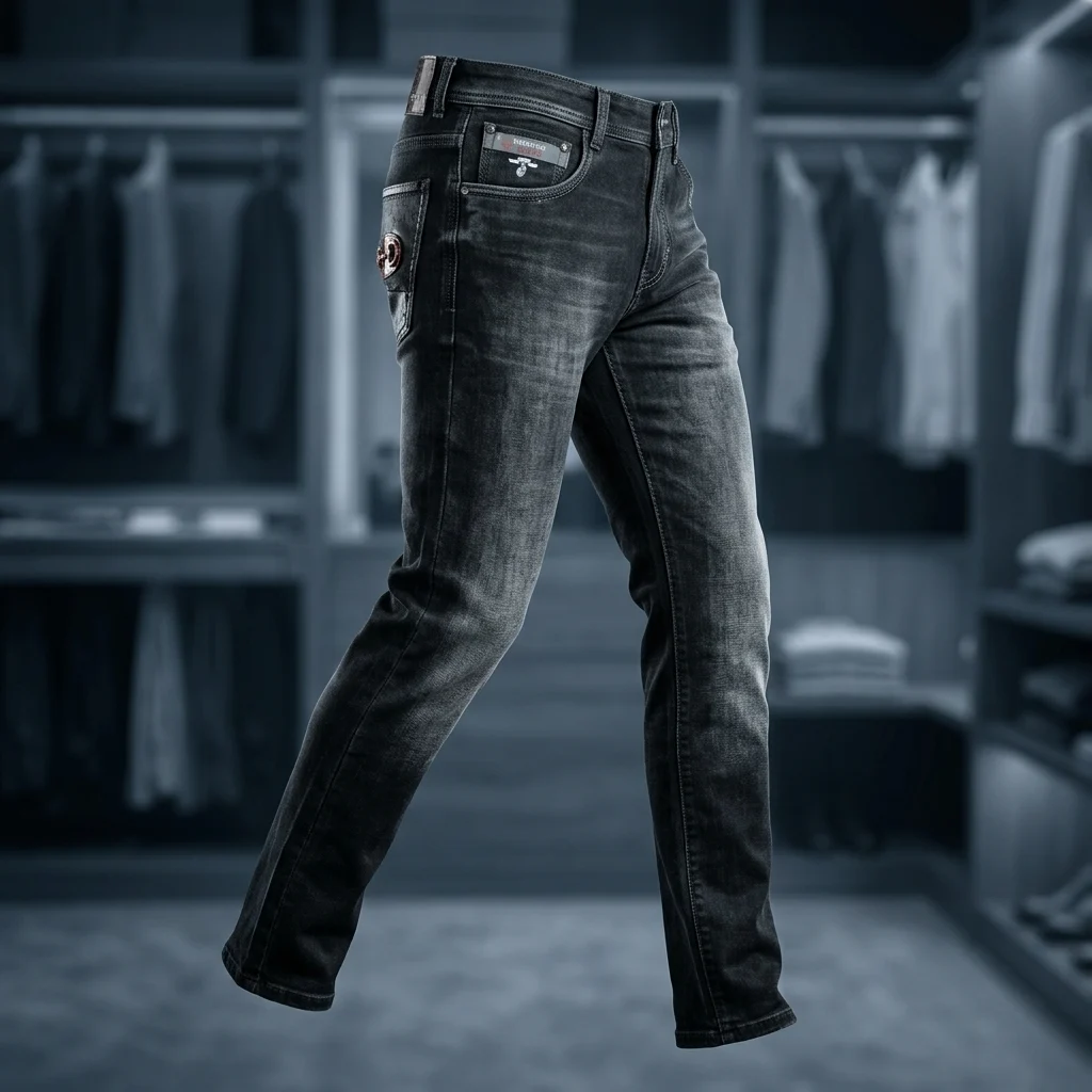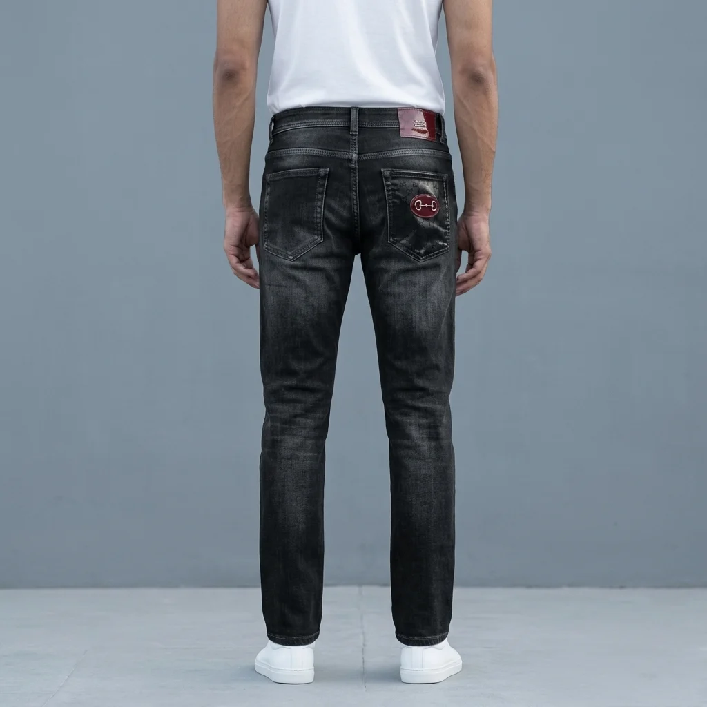 Refined Wash: Faded charcoal/black finish with whiskering at the thighs for an authentic, aged texture.