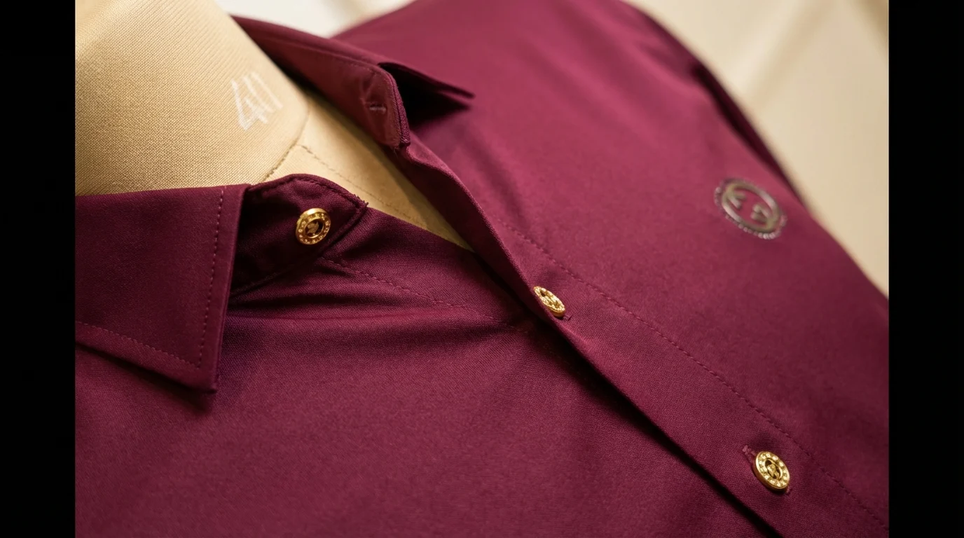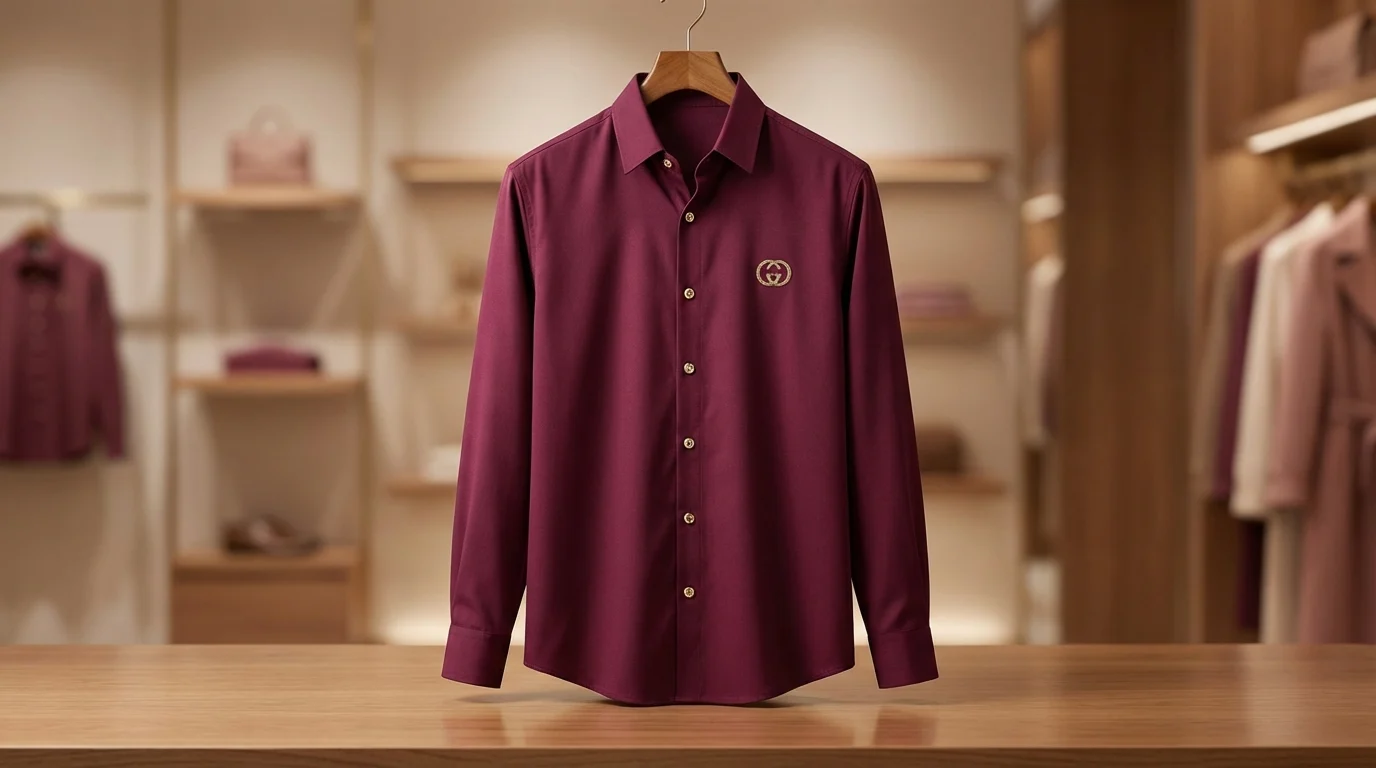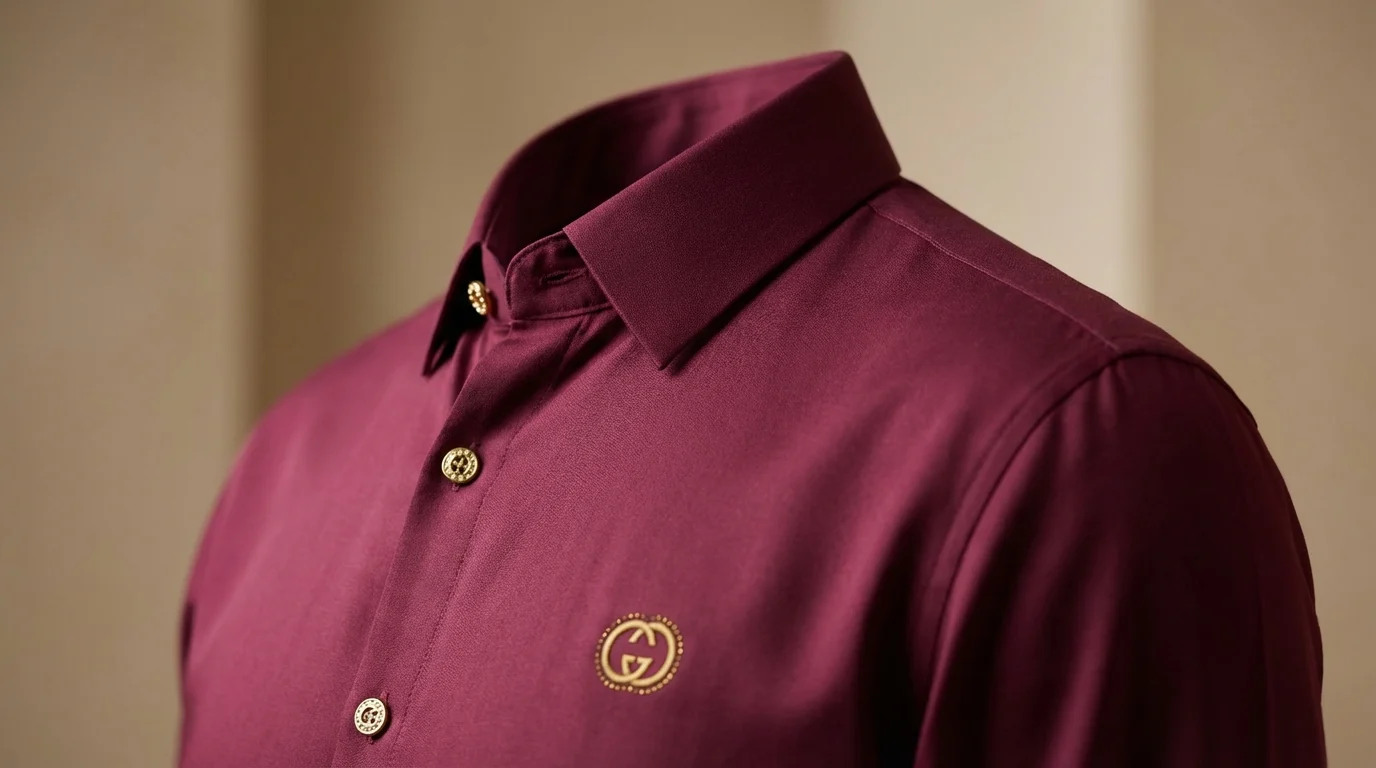 Make a powerful sartorial statement with this Gucci Men’s Luxury Shirt in a deep wine red. This piece represents the perfect marriage of classic Italian craftsmanship and bold, modern aesthetics. The rich jewel tone of the fabric serves as an elegant canvas for the house’s signature gold-tone hardware, creating a look that is both authoritative and refined.
