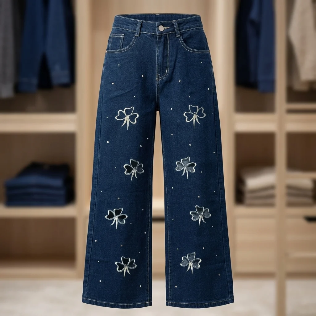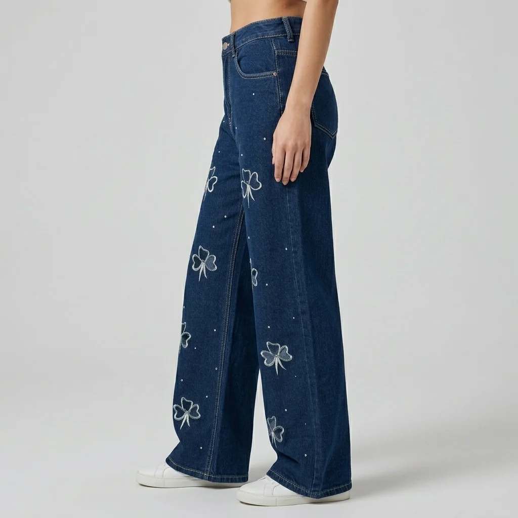 Feature Details SKU Id 70005220260428 Category Bottom Wear / Jeans Gender Women Dress Type Wide-Leg Jeans Fabric Denim Fit Type Wide Leg / High Rise Length Full Length Pattern / Print Floral Embroidery & Rhinestone Occasion Casual, Brunch, Evening Wear Season All-Season / Transitional Care Instructions Hand wash cold or gentle machine wash inside out to protect embroidery.
