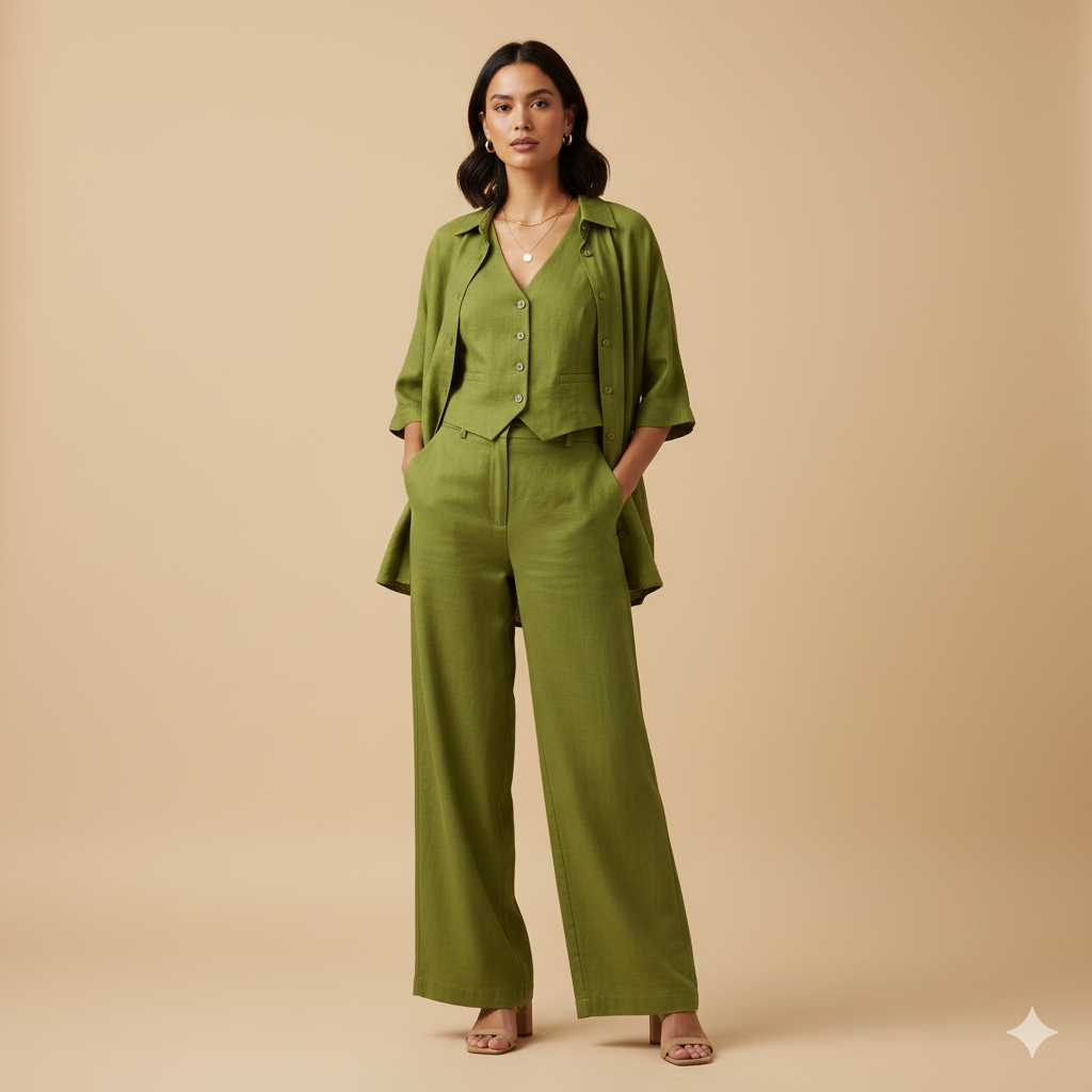 The Silhouette: A relaxed-fit, elongated turtleneck tunic paired with matching high-tapered trousers creates a sleek, monochromatic “luxury loungewear” look.