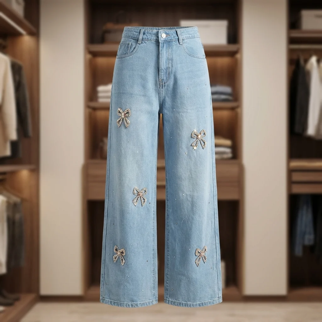 Elevate your denim collection with these Light Blue Embellished Wide Leg Jeans. Moving away from the basic aesthetic, these jeans introduce a touch of whimsy with sparkling rhinestone bow motifs scattered across the front. The light wash offers a vintage, lived-in feel, while the high-quality denim ensures the wide-leg silhouette maintains its sophisticated shape throughout the day.