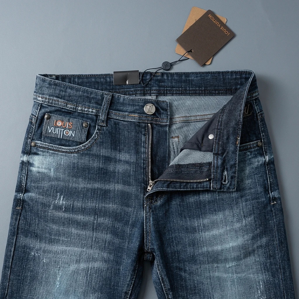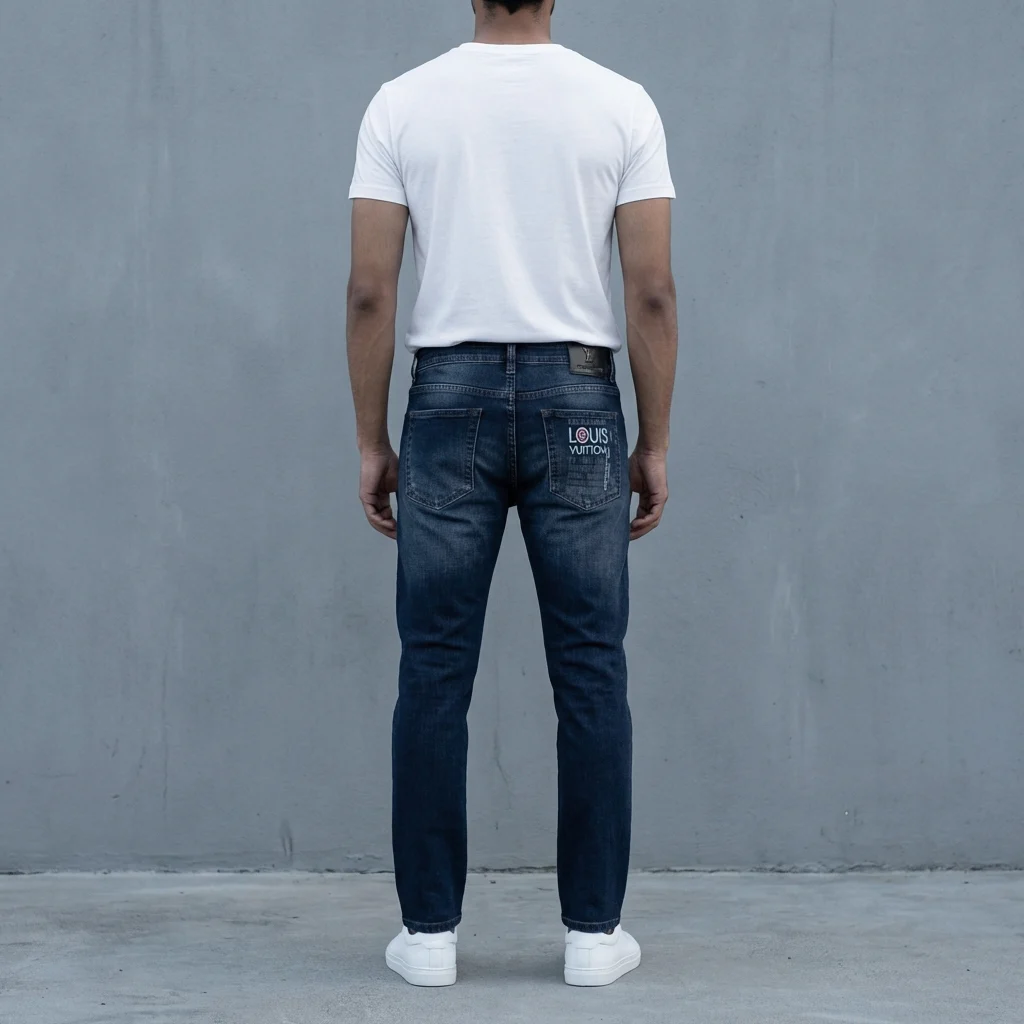 Designed for the discerning individual, the pair is accented with custom LV-branded metal hardware and a distinct logo patch on the coin pocket. Whether styled with a crisp linen shirt for a polished weekend ensemble or paired with a graphic tee for a relaxed look, these jeans offer unparalleled versatility. The slim-tapered cut provides a sharp profile, making them a definitive investment piece for the fashion-forward man.