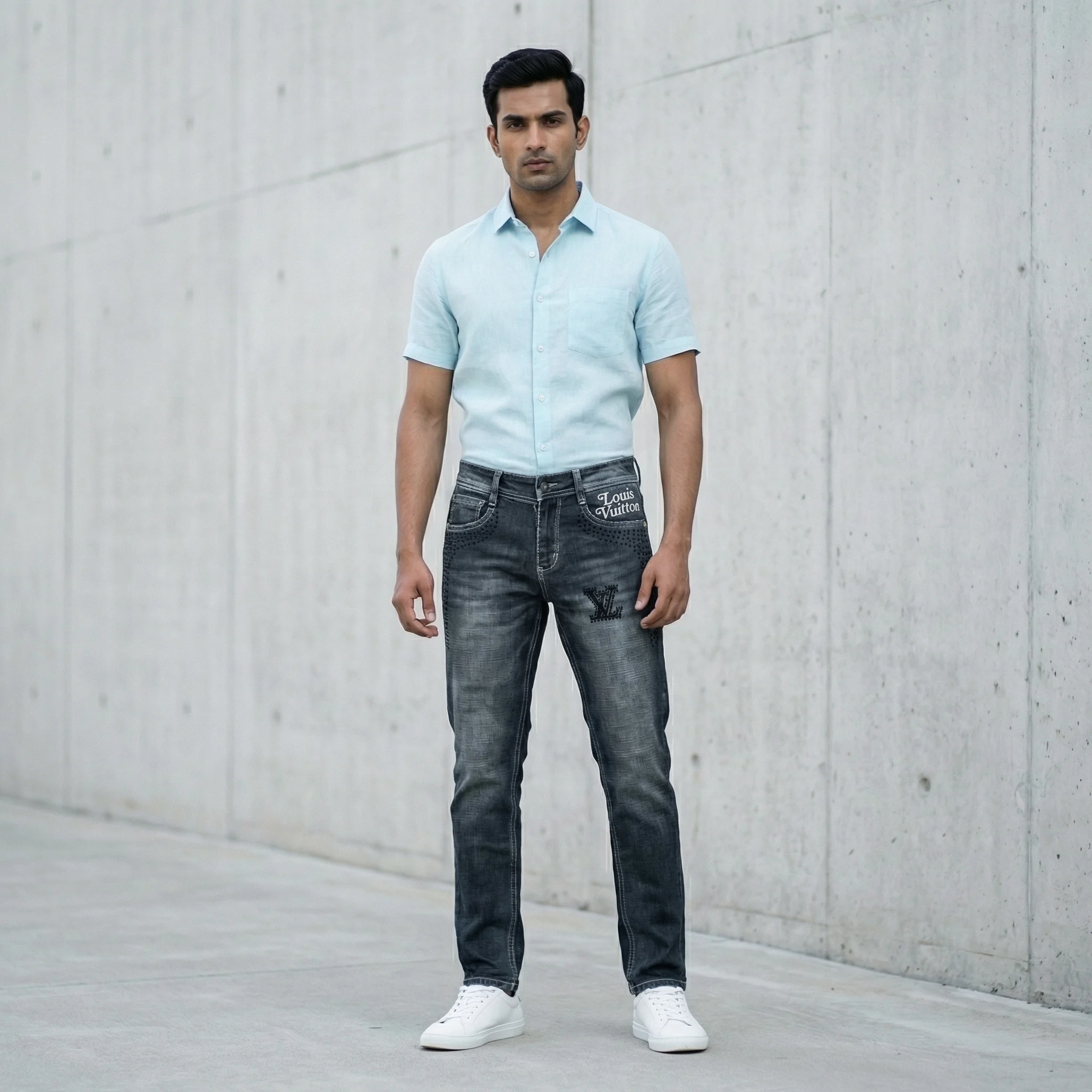 Elevate your street-style credentials with these Louis Vuitton denim jeans, designed for the man who appreciates the intersection of luxury and rebellion. These jeans feature a meticulously distressed dark grey wash, offering a lived-in feel that remains polished enough for upscale environments. The standout detail is the iconic LV logo on the thigh, rendered in high-shine black studs for a tactile, premium finish.
