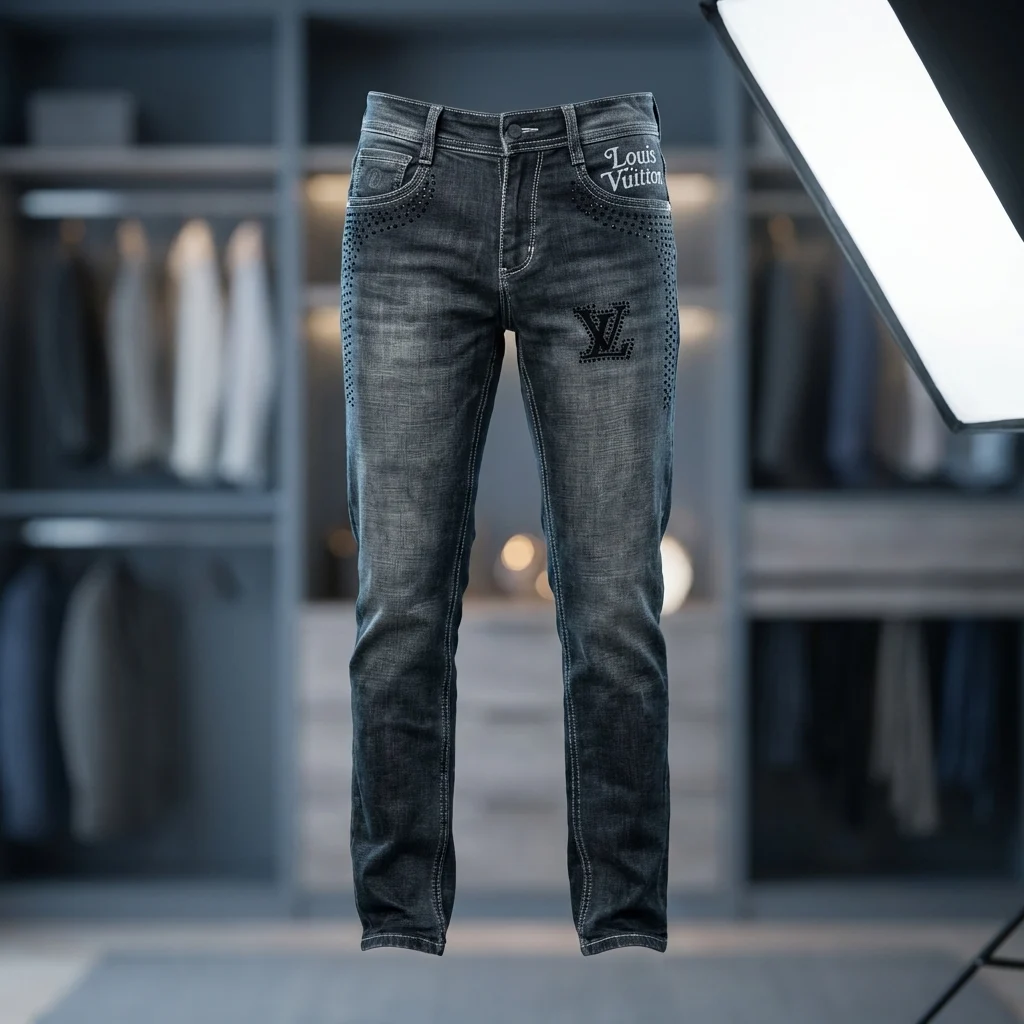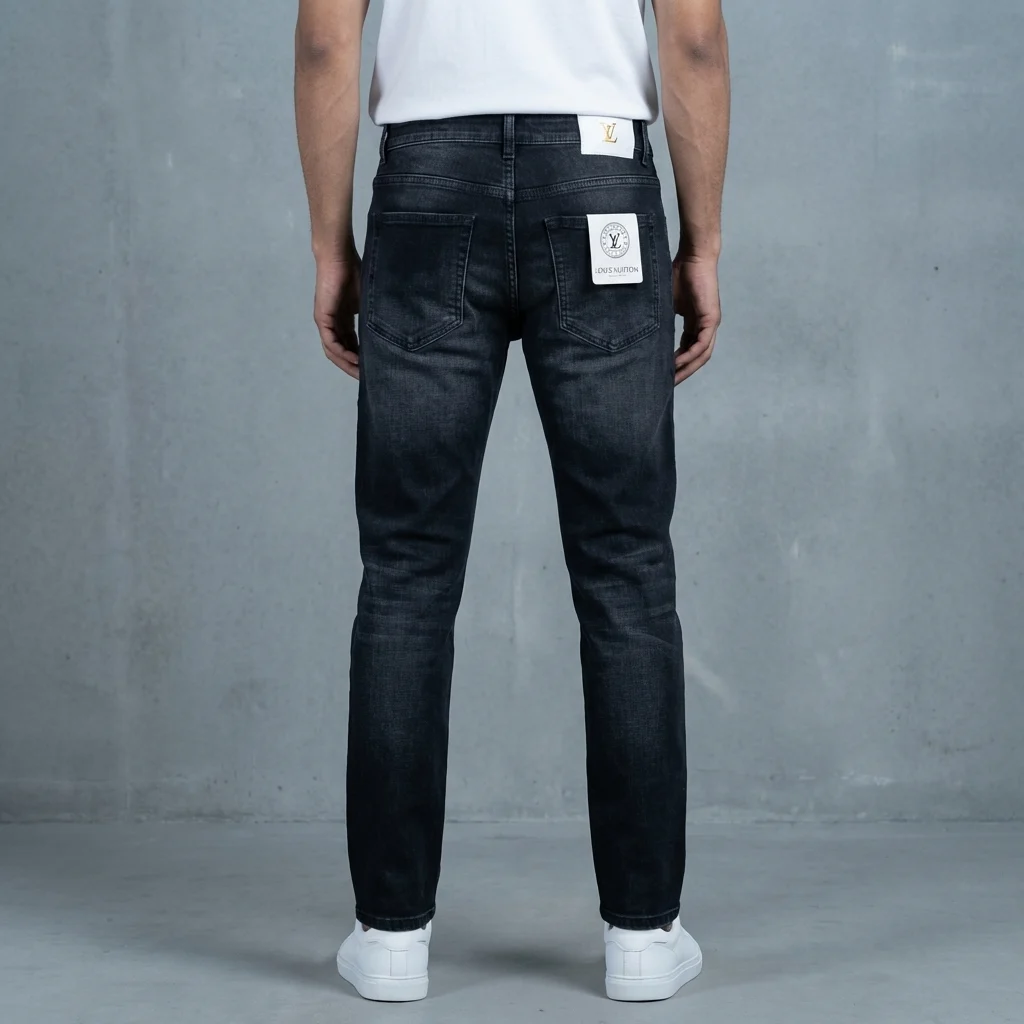 Constructed with precision, the denim showcases high-contrast stitching that defines the slim-fit silhouette. Whether paired with a crisp linen shirt for a balanced daytime look or a leather jacket for the night, these jeans serve as a statement piece in any curated wardrobe. The attention to detail extends to the interior waistband, featuring stylized “Louis Vuitton” typography, ensuring luxury is felt in every stitch.