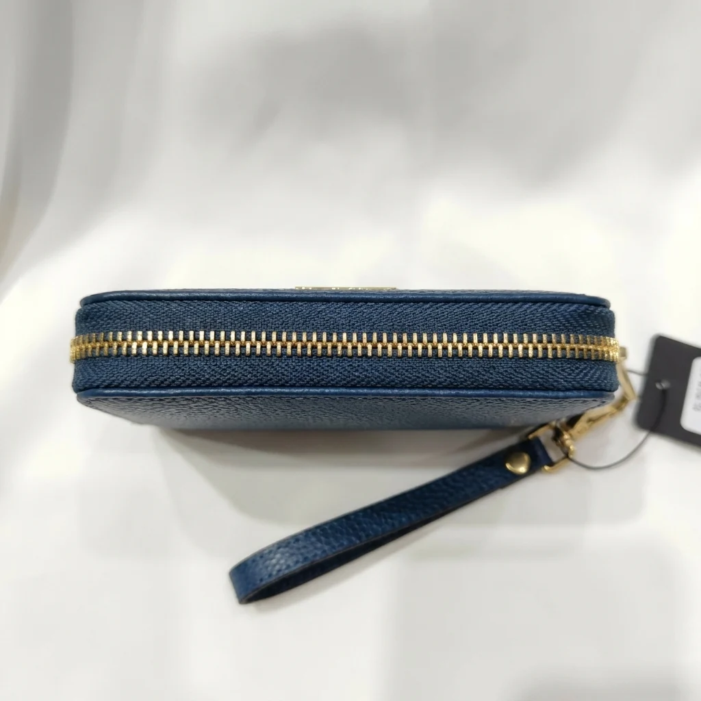 The interior is thoughtfully divided into multiple gusseted compartments, allowing you to separate currency from cards seamlessly. Whether tucked into a larger handbag or carried as a standalone clutch for quick errands, its textured finish offers a tactile grip and durable resilience against daily wear. The gold-finish hardware adds a warm, radiant contrast to the cool blue leather, finishing the piece with a classic touch of opulence.