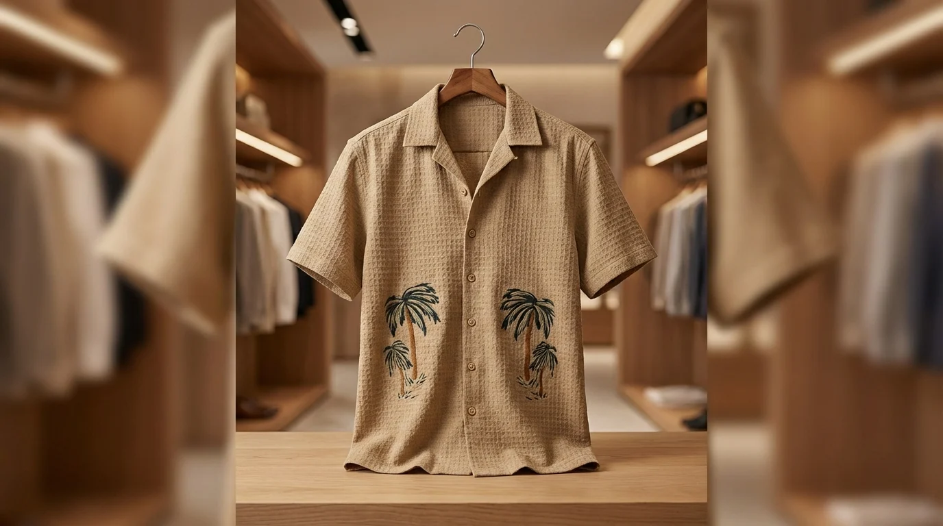 • Artisanal Embroidery: Featuring dual tonal palm tree motifs for a resort-wear aesthetic.