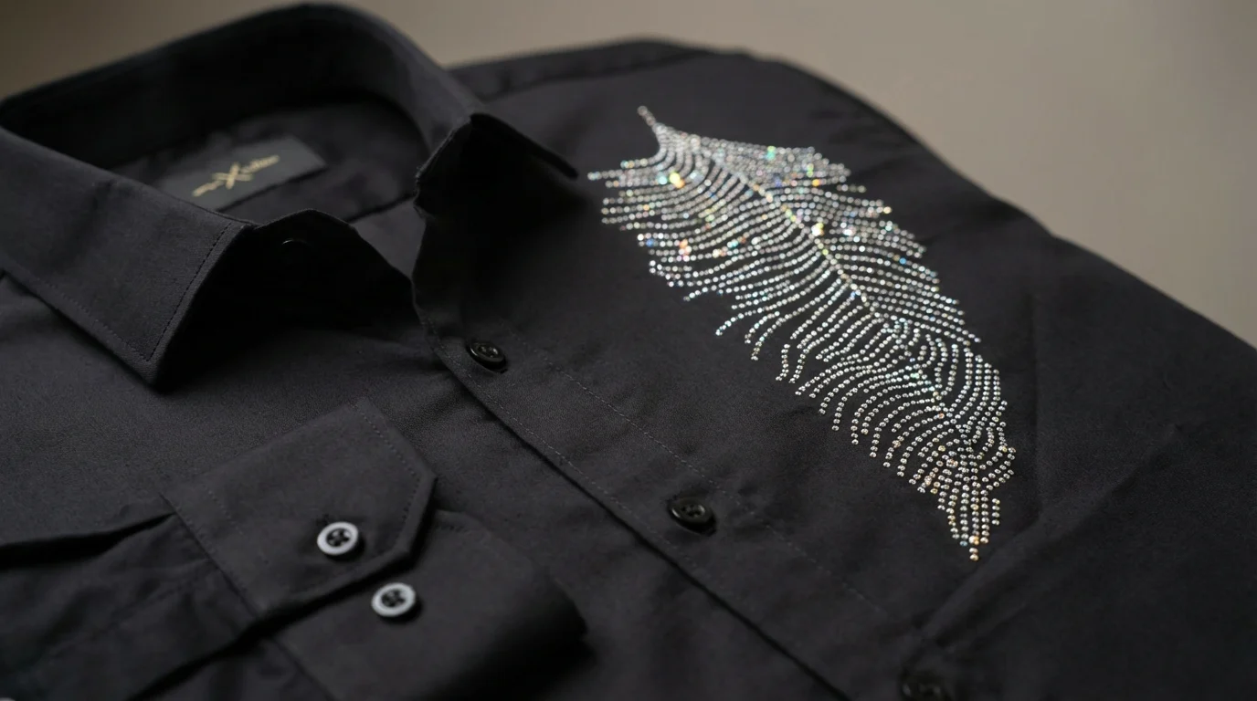 Rhinestone Embellishment: High-density, hand-applied style feather motif on the left chest with multi-faceted sparkle.