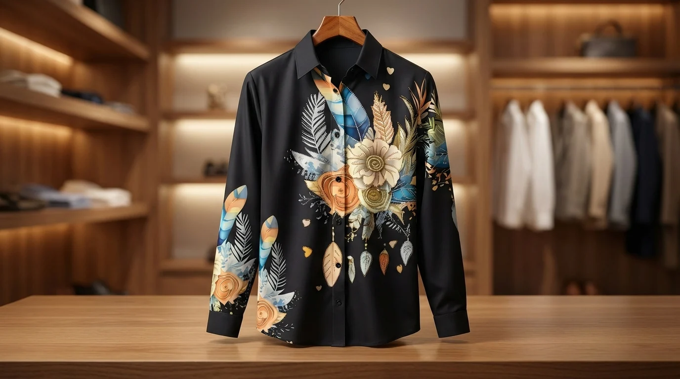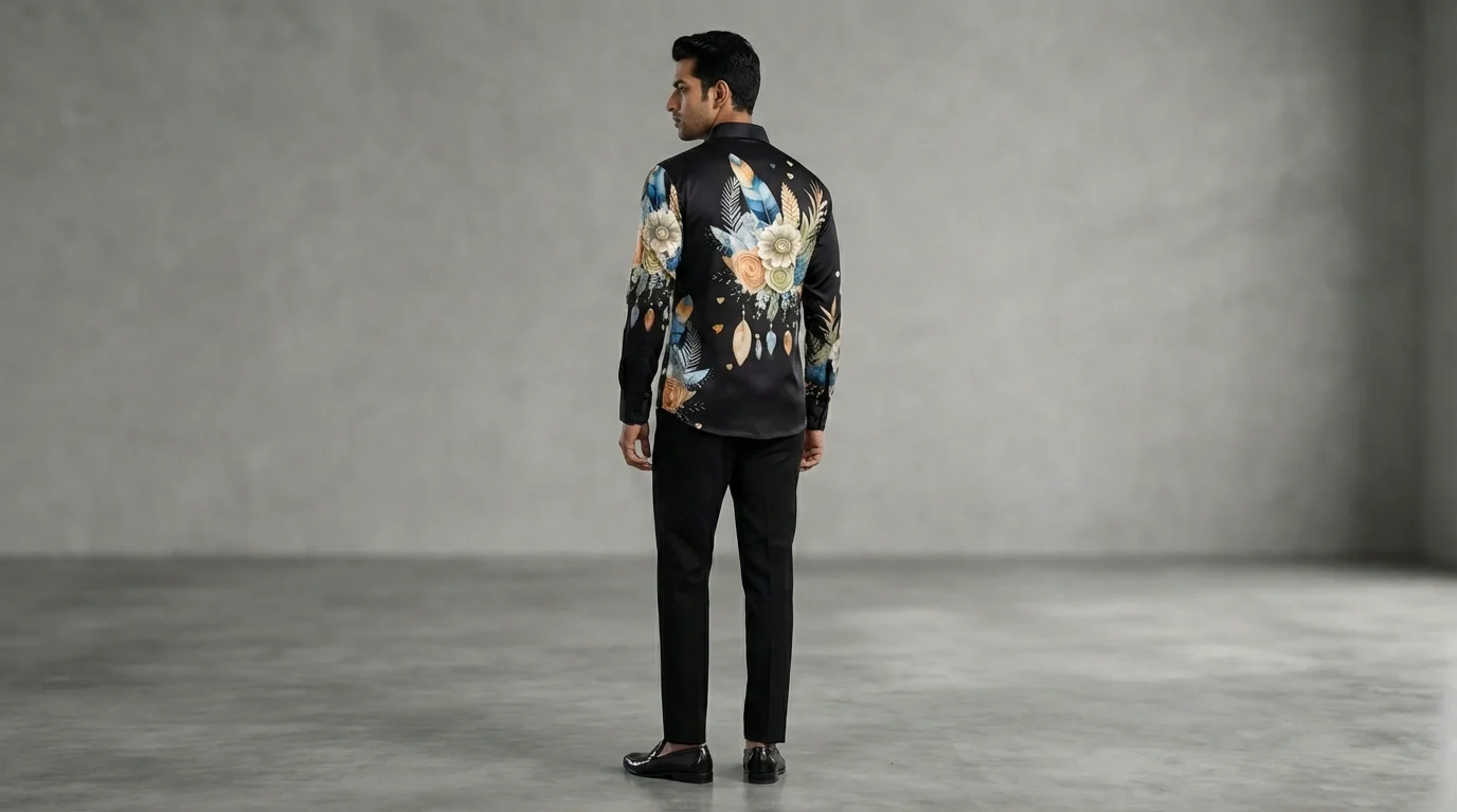 Redefine contemporary luxury with this Men’s Black Floral Print Shirt. Designed for the man who appreciates fine artistry, the deep black base is adorned with a meticulously detailed botanical pattern. The mix of warm orange roses, soft cream flowers, and cool blue feathers creates a visual masterpiece that transitions beautifully from daylight events to evening celebrations.