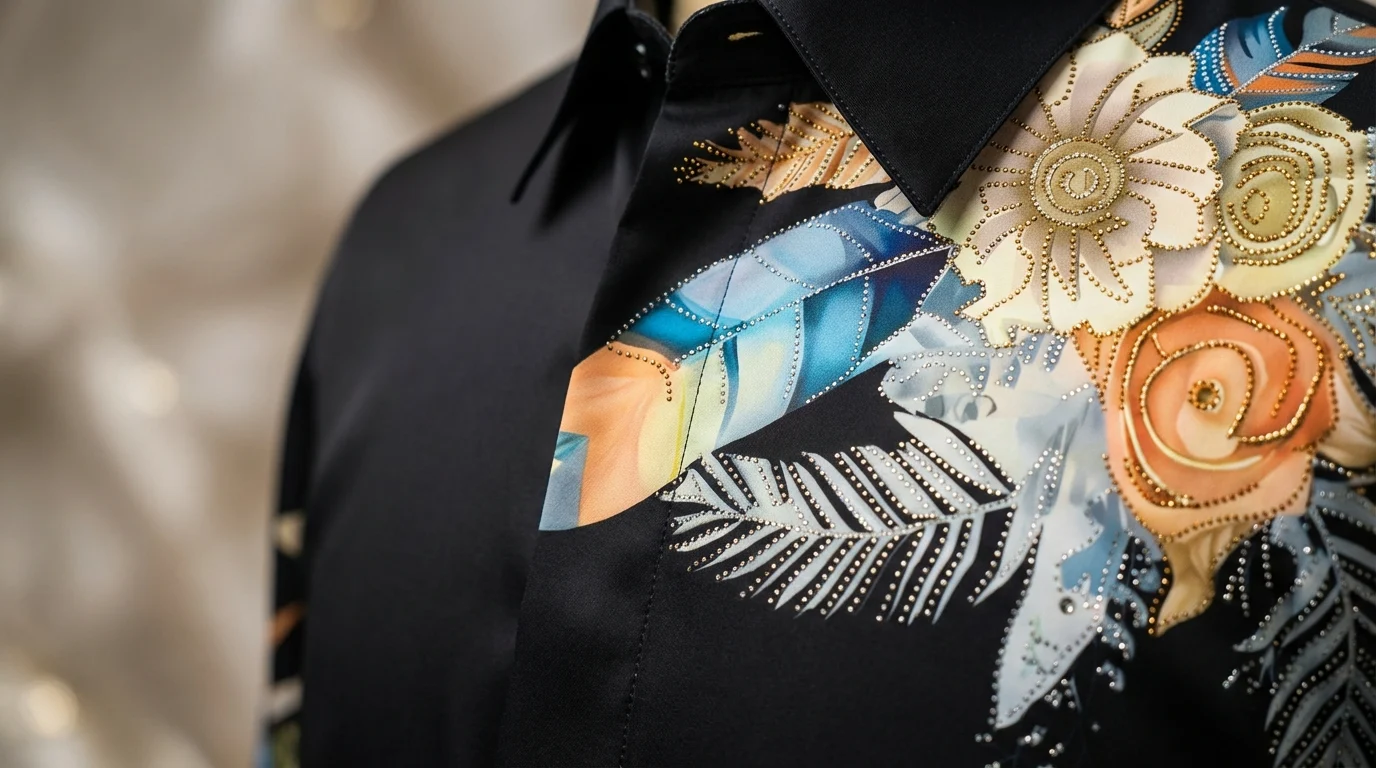 What sets this piece apart is the subtle application of miniature rhinestones following the contours of the print, providing a discreet yet captivating sparkle under ambient lighting. The high-quality construction ensures a structured drape, while the smooth-finish textile provides maximum breathability for the Indian climate. Pair it with dark trousers and leather loafers for a refined, fashion-forward ensemble.