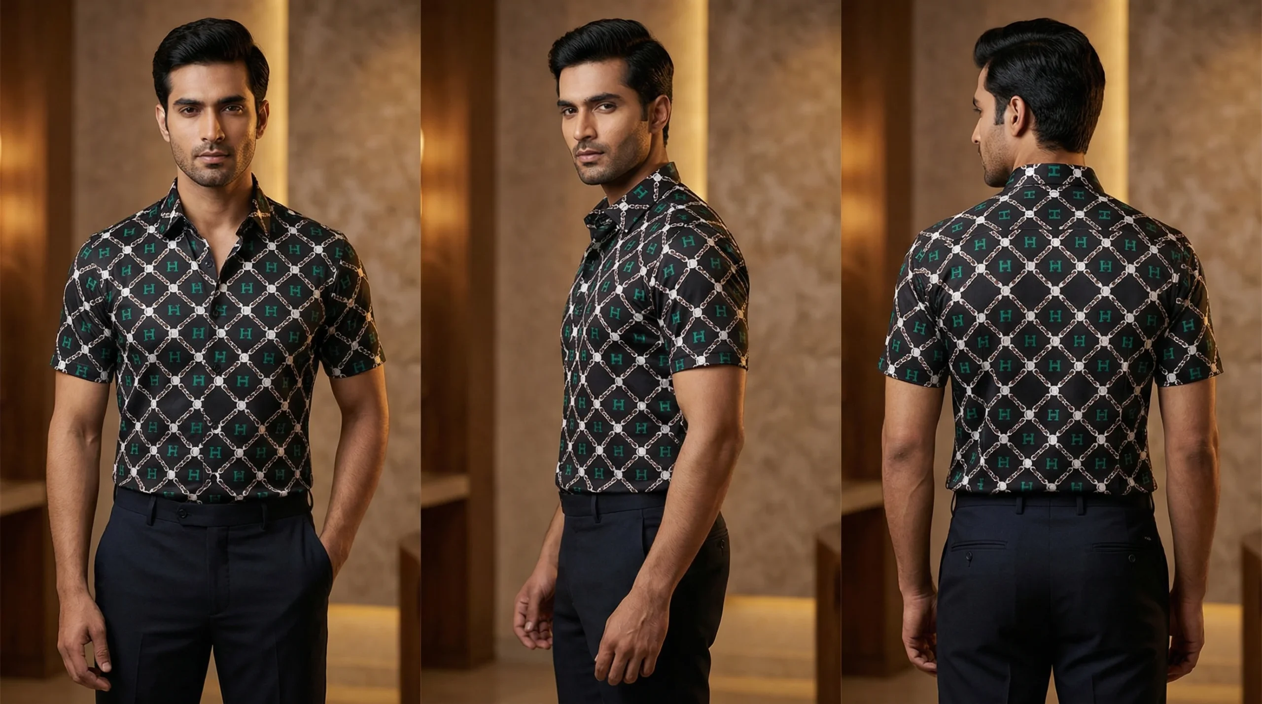 Constructed with a focused eye on detail, this short-sleeved shirt features a crisp pointed collar and a seamless button-down front that aligns perfectly with the geometric print. The lightweight, smooth-finish fabric ensures all-day comfort, making it a staple for premium casual wardrobes in the Indian climate. Whether paired with tailored black trousers or slim-fit chinos, this shirt exudes a polished, designer-led aesthetic.
