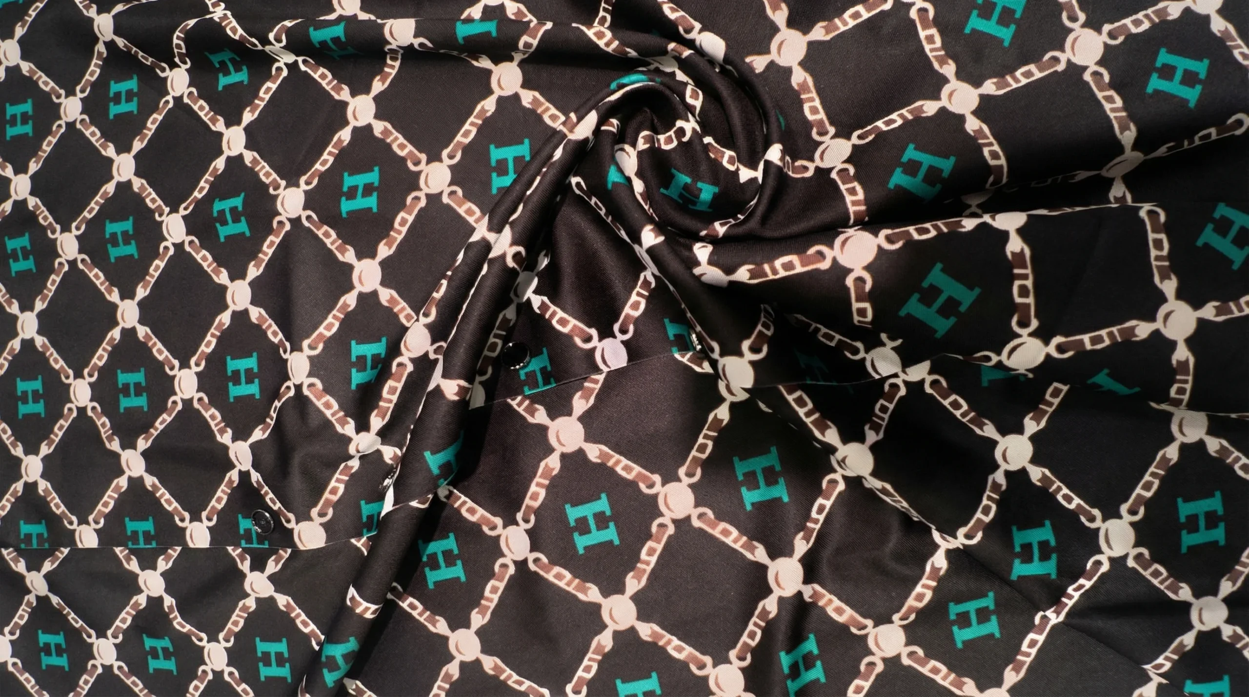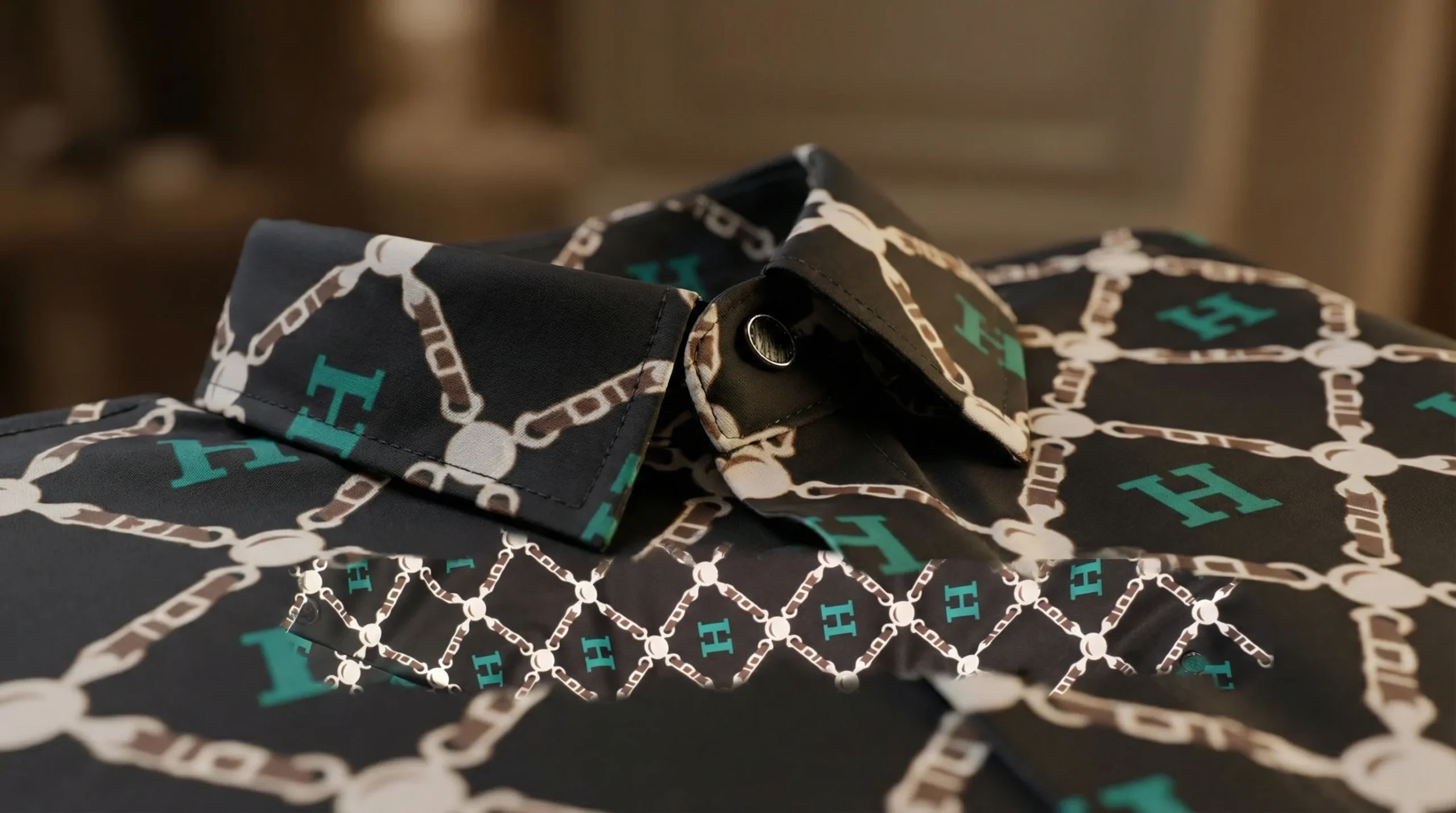 Elevate your sartorial collection with this striking Monogram Geometric Print Shirt. The design features a meticulous white chain-link lattice over a deep black base, creating a structured diamond pattern. At the center of each diamond sits a vibrant teal “H” monogram, providing a pop of designer color that demands attention while maintaining an air of understated luxury.