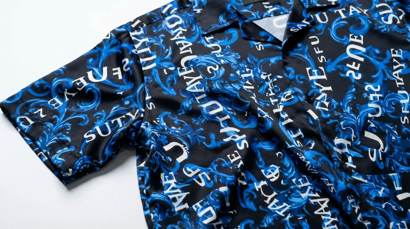 Redefine your leisure wardrobe with this striking short-sleeve shirt, designed for the modern individual who commands attention. Featuring a deep obsidian base layered with electric blue baroque scrolls and bold typographic accents, this piece strikes a perfect balance between classic ornamental art and contemporary streetwear aesthetics.