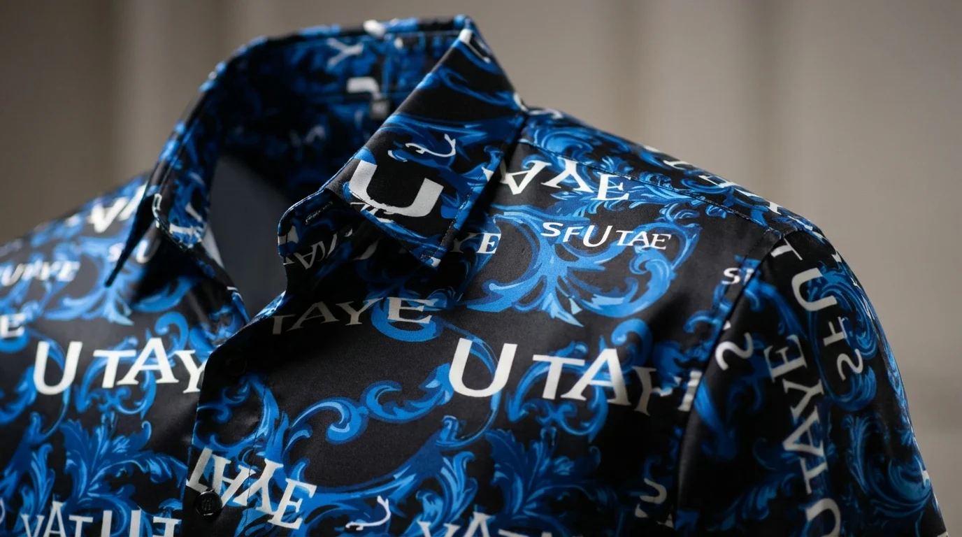 Signature Print: Bold blue baroque motifs fused with modern typography.