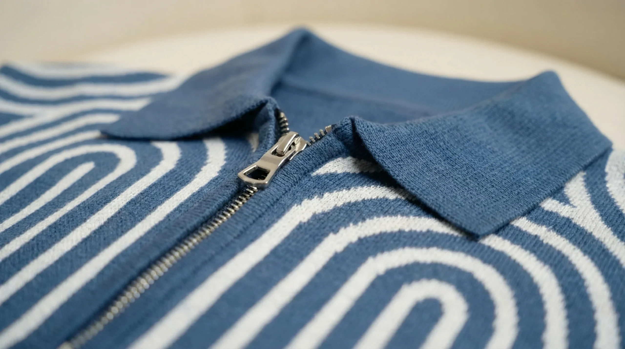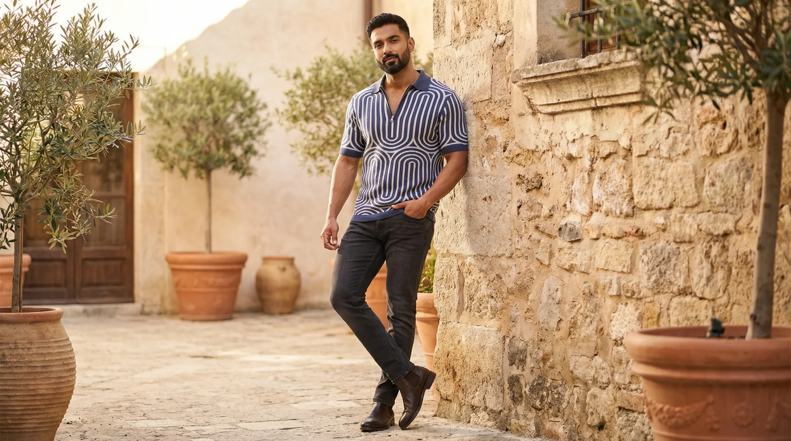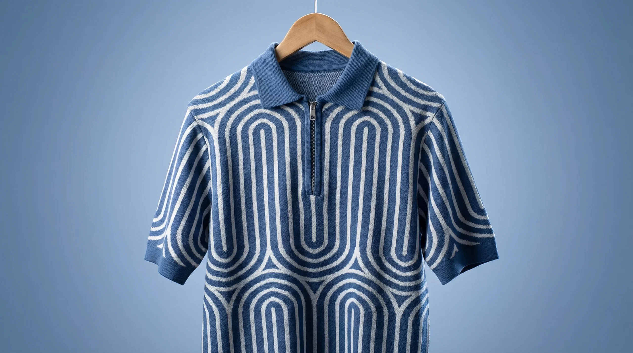 Redefine your wardrobe with this Blue Geometric Knit Quarter-Zip Polo. This piece captures the essence of contemporary “Old Money” aesthetics, blending vintage patterns with a sharp, modern cut. The intricate ivory and blue jacquard-style knit creates a rhythmic U-shaped motif that provides visual depth and a sophisticated edge.