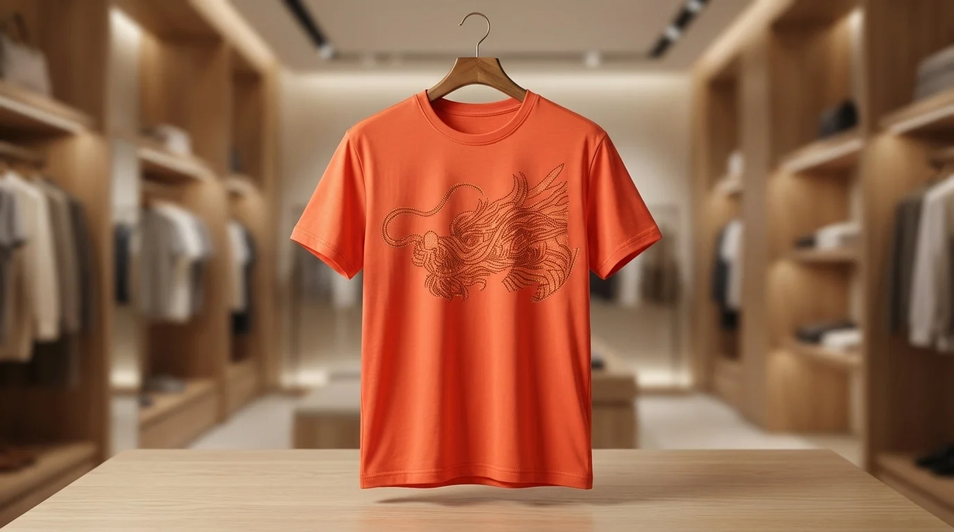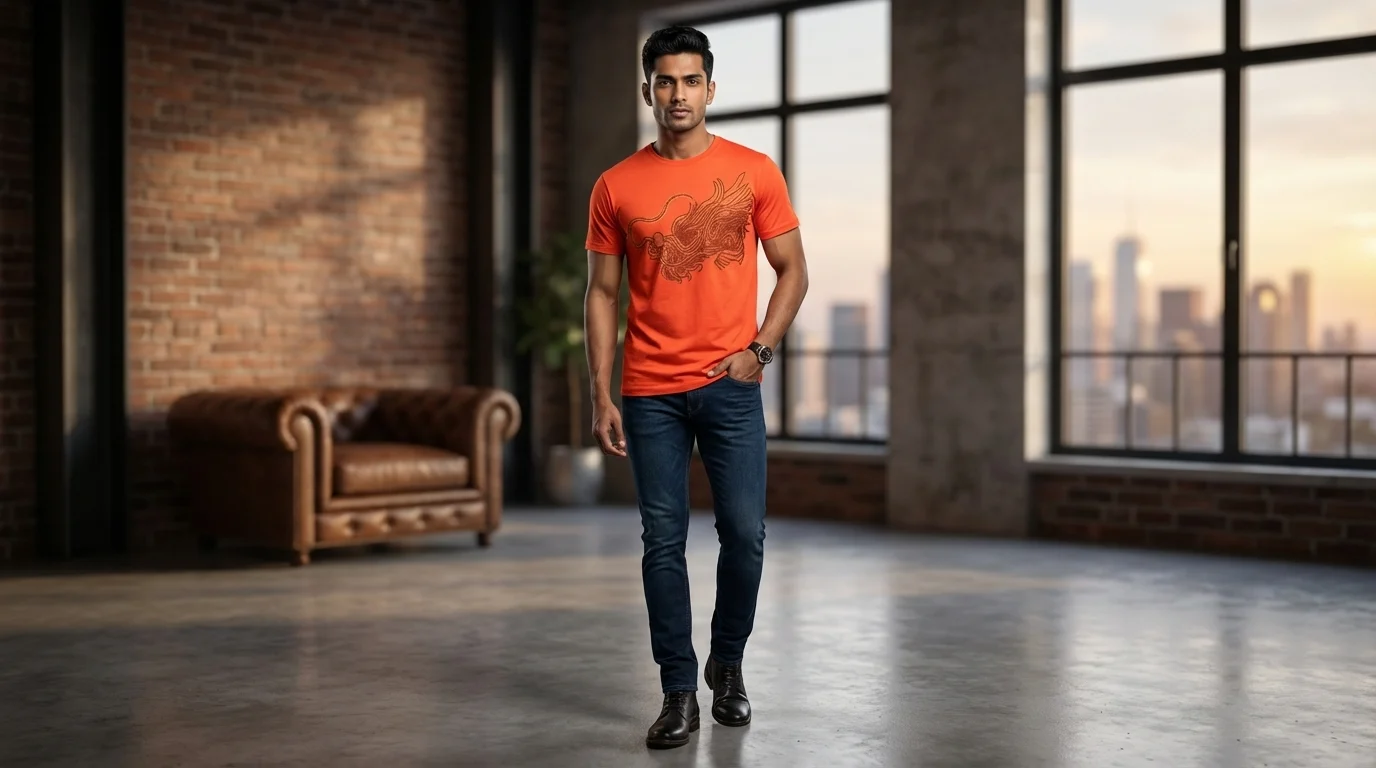 Elevate your casual repertoire with this meticulously crafted burnt orange t-shirt, designed for the modern Indian man who values subtle luxury. The piece features a striking, high-definition dragon motif, rendered through intricate tonal embellishments that catch the light with every movement. This isn’t just a graphic tee; it is a statement of refined craftsmanship that bridges the gap between contemporary streetwear and high-fashion artistry.
