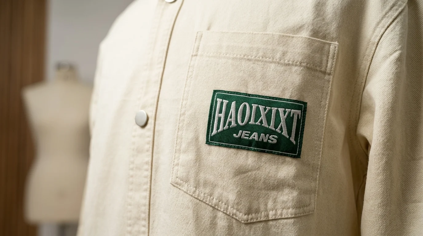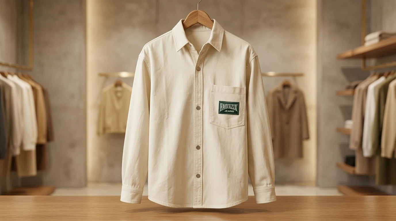 Rugged Heritage Style: A versatile cream overshirt featuring a distinct green “HAOIXIXT JEANS” embroidered patch for a vintage-inspired aesthetic.