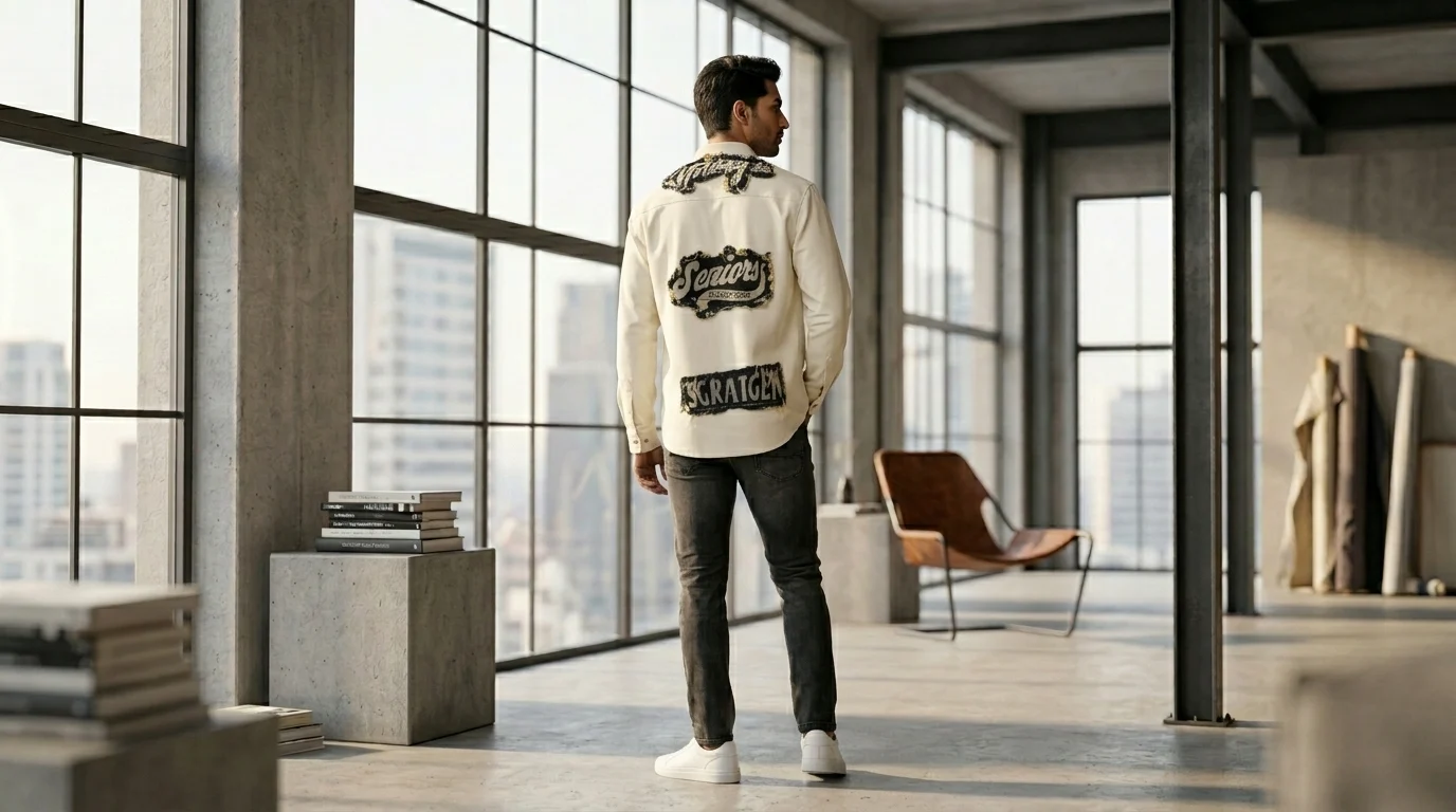 Designed with a nod to industrial workwear, this shirt features a prominent chest pocket adorned with a high-contrast forest green brand patch. The metallic snap buttons and structured collar give it a polished finish, ensuring you look put-together whether you’re at a creative workspace or heading out for a weekend coffee.