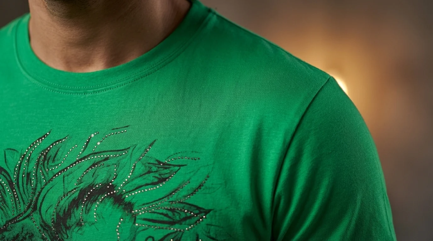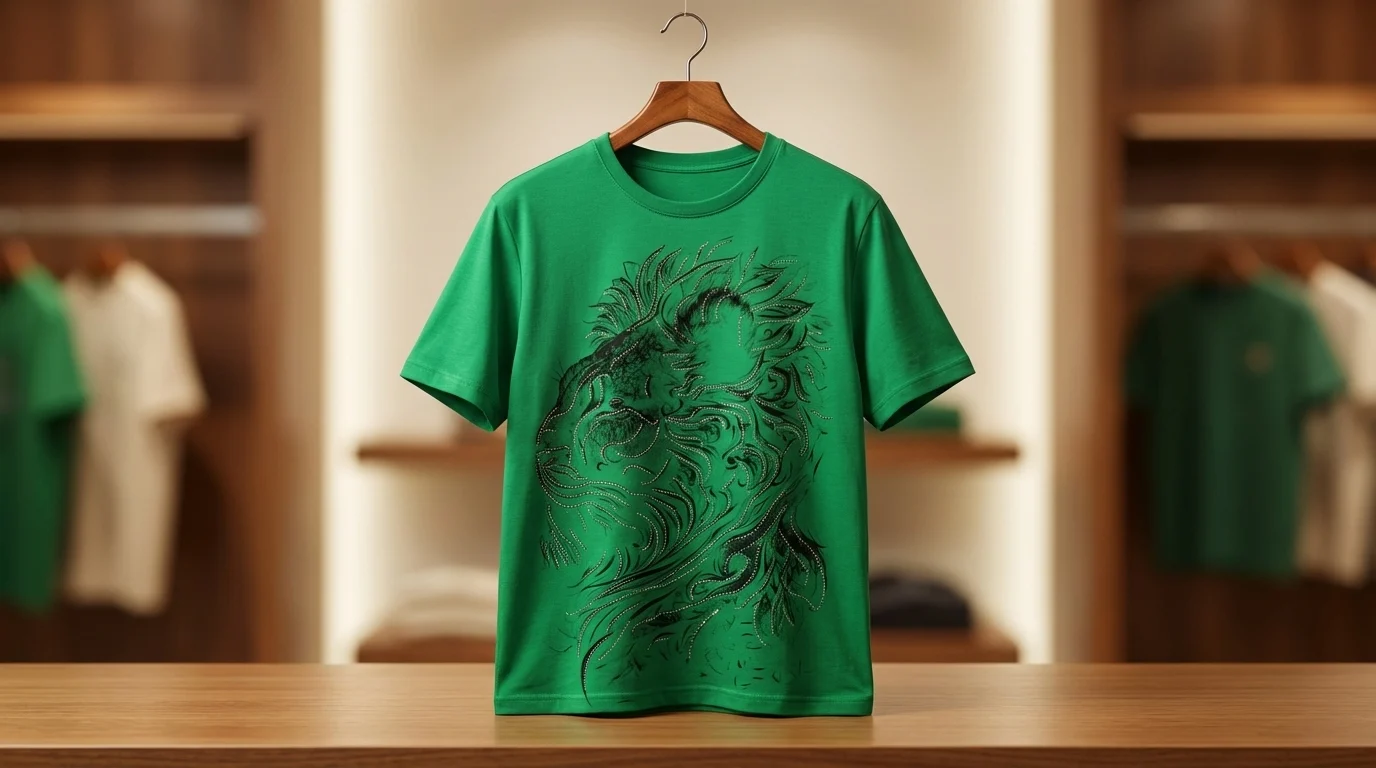 Elevate your everyday wardrobe with this striking Emerald Green T-shirt, a fusion of bold artistry and refined craftsmanship. Featuring a centerpiece lion motif, the design is meticulously rendered with intricate line work and subtle embellishments that catch the light, offering a sophisticated take on the classic graphic tee.