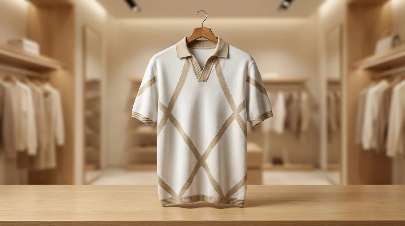 Redefine your casual repertoire with this meticulously crafted knit polo, where architectural precision meets effortless comfort. The garment features a sophisticated cream-toned base, accented by a bold beige geometric diamond pattern that flows seamlessly across the chest. Designed for the modern Indian man who values understated luxury, this piece transitions fluidly from high-stakes creative meetings to weekend sun-drenched brunches.