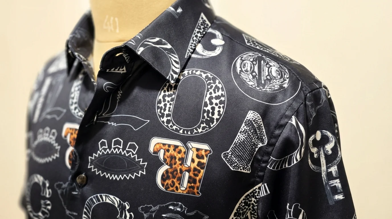 Elevate your leisure wardrobe with this premium navy blue resort shirt, featuring an intricate monogram and graphic print. Designed for the modern man who appreciates high-fashion aesthetics, the garment showcases bold geometric patterns, leopard-accented lettering, and iconic branding throughout. The deep navy base provides a sophisticated canvas for the contrasting white and ochre elements, creating a look that is both striking and versatile.