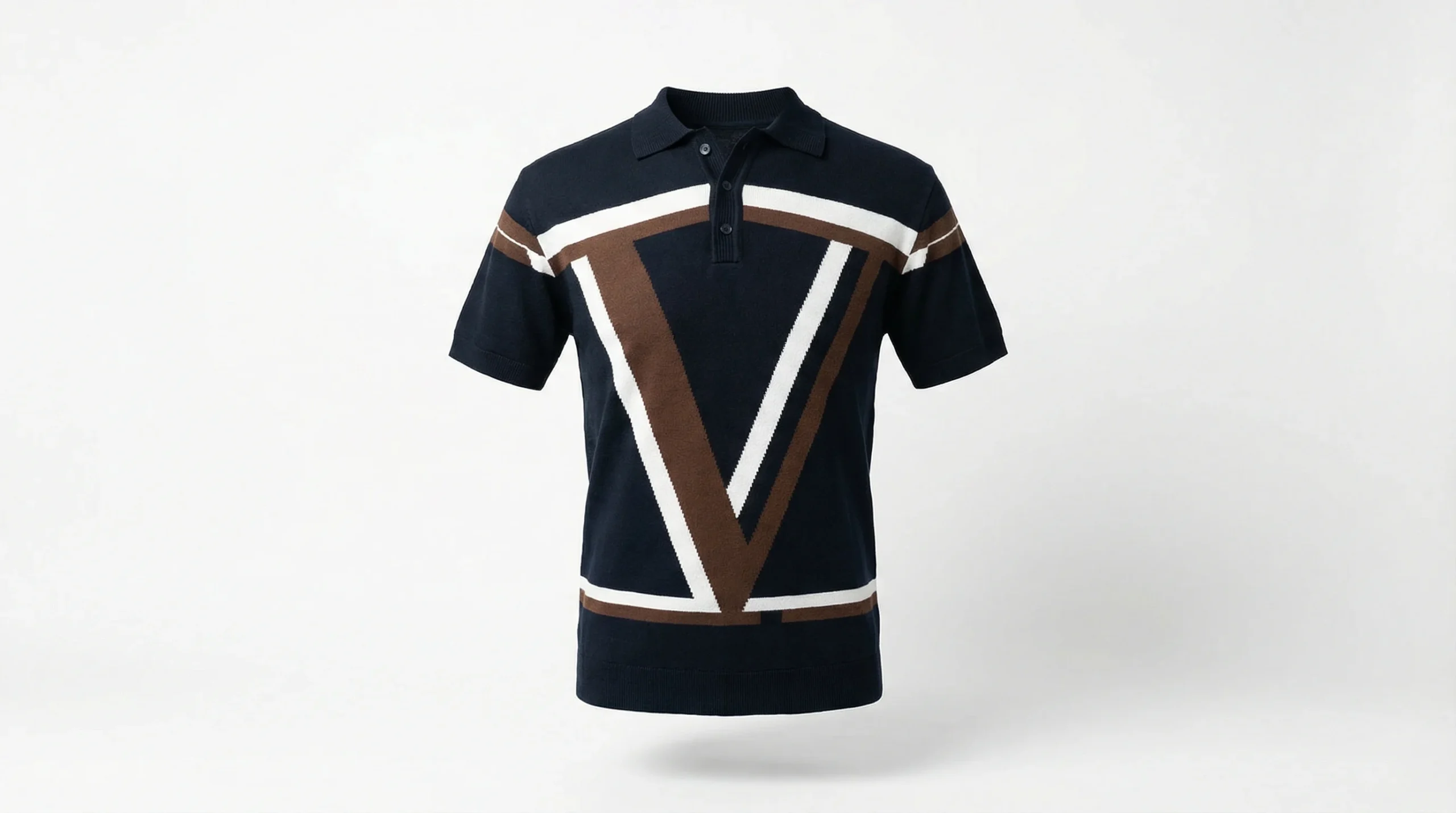 Elevate your wardrobe with a piece that balances artistic expression and classic tailoring. This premium knit polo shirt features a sophisticated navy base, accented by striking tan and white geometric patterns that draw the eye and broaden the silhouette. The textured knit construction provides a refined alternative to the standard piqué polo, offering both luxury and longevity.