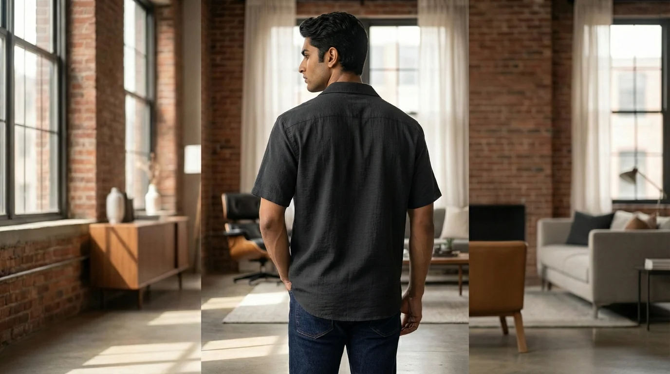 The design centers on a refined Cuban collar and a clean button-down front, offering a seamless transition from a high-stakes creative meeting to an evening at an upscale lounge. Whether paired with tailored trousers or structured chinos, its breathable construction and deep charcoal-black hue provide a versatile foundation for any curated look.