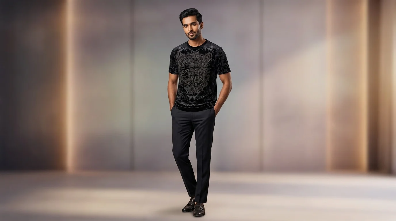 Elevate your evening wardrobe with this masterfully crafted black velvet T-shirt. Designed for the modern Indian man who appreciates bold, high-fashion aesthetics, this piece features a striking tiger motif rendered in intricate tonal embellishments. The plush velvet fabric offers a rich, multidimensional sheen that catches the light, making it a definitive statement piece for high-end gatherings and nightlife.