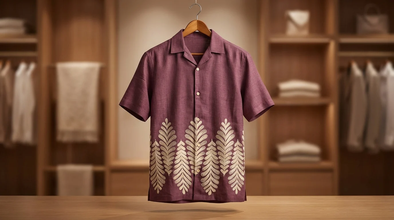 The lower half of the garment features a striking, symmetrical fern leaf motif in a contrasting cream embroidery-style print. Designed with a relaxed yet tailored silhouette, this shirt transitions effortlessly from a sun-drenched brunch in Goa to a refined evening sundowner. It’s a statement of understated luxury that prioritizes both comfort and character.
