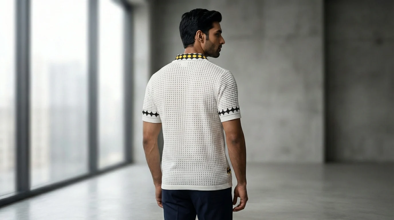 Designed for the discerning individual, the shirt showcases a structural point collar and a clean-lined placket. The play of textures—from the perforated knit sleeves to the smooth-ribbed hem—creates a multidimensional look that stands out in any premium setting. Whether paired with tailored trousers or relaxed linens, it serves as a centerpiece of contemporary Indian summer styling.
