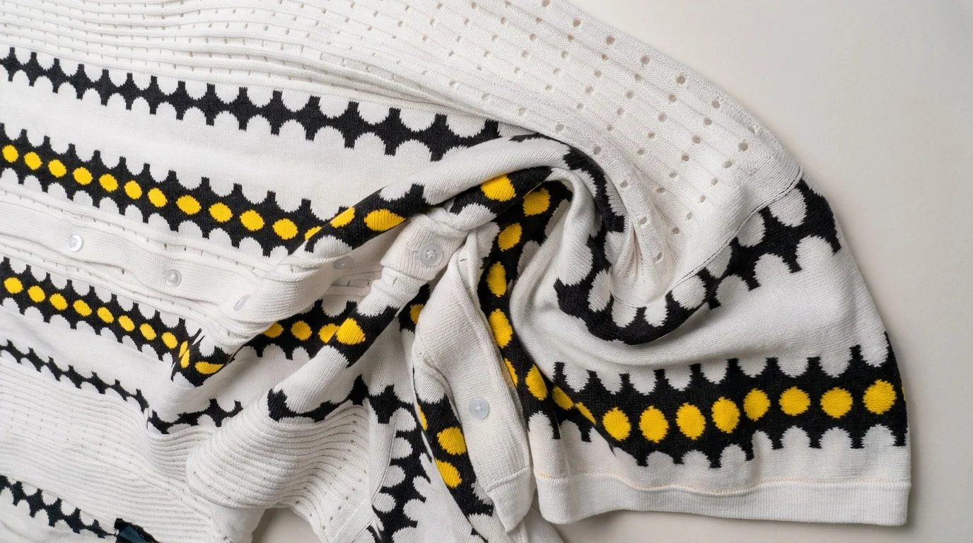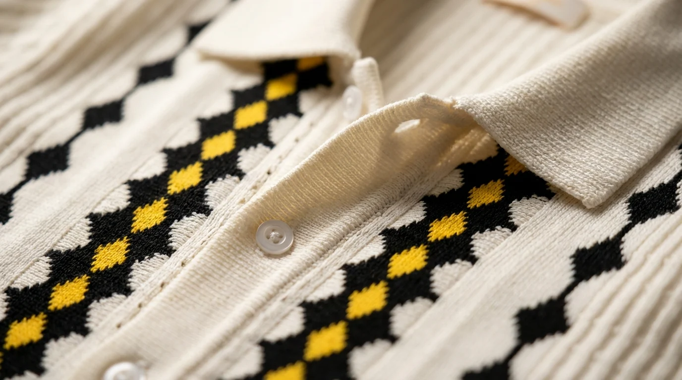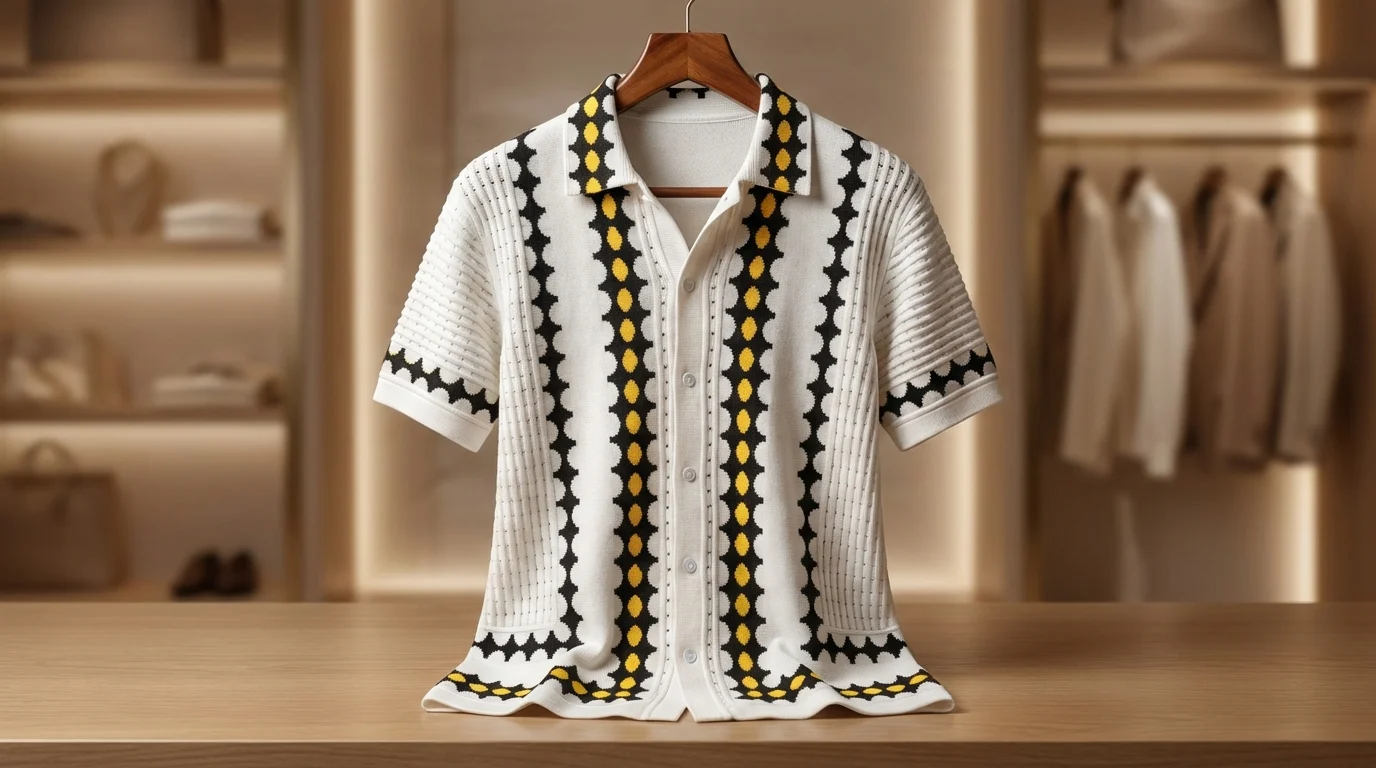 Elevate your resort wear with this meticulously crafted off-white knit shirt. Featuring a bold, vertical geometric pattern in contrast black and vibrant yellow, this piece redefines the modern polo silhouette through a sophisticated button-down lens. The intricate open-knit texture offers a breathable, tactile experience that balances high-fashion aesthetics with effortless comfort.