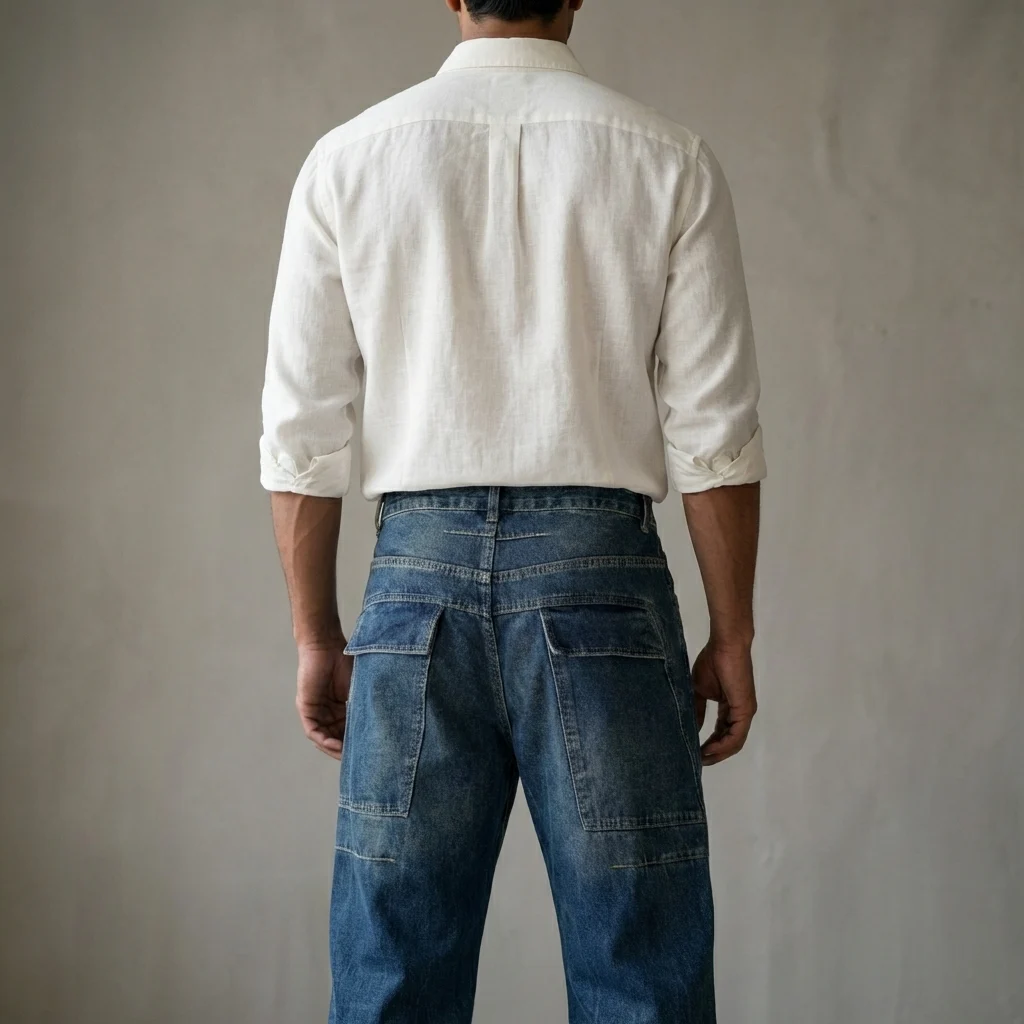 Contemporary Utility: A modern take on the classic baggy, featuring unique front-panelled pockets for a rugged yet refined aesthetic.