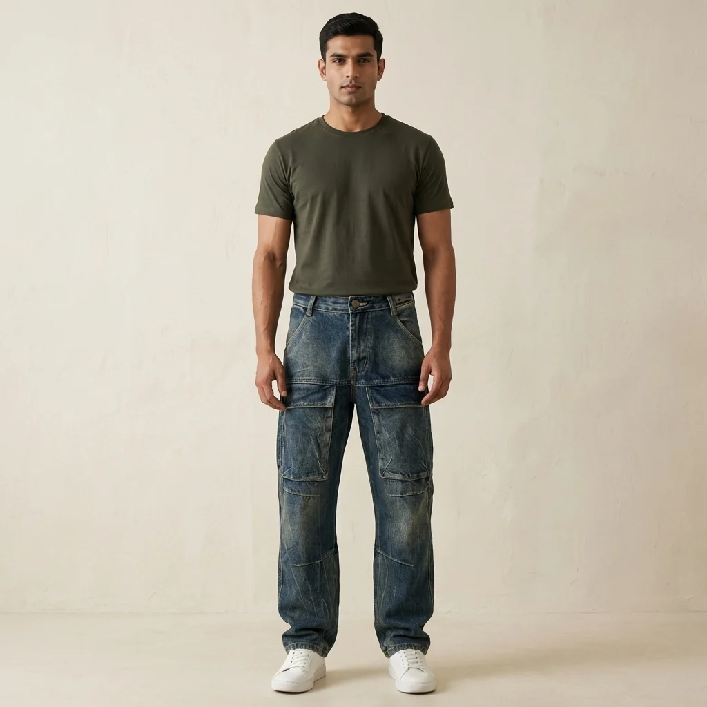 Feature Details SKU ID 70005220260325 Category Bottom Wear Gender Men Dress Type Baggy Jeans Fabric Denim (Textured Cotton) Fit Type Relaxed Fit Length Full Length Pattern / Print Panelled / Solid Wash Occasion Casual / Streetwear Season All-Season Care Instructions Machine wash cold, inside out; Tumble dry low