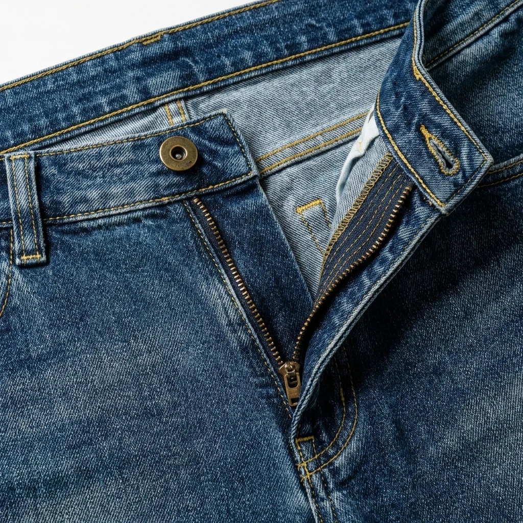 Hardware Details: Reinforced metal button closure with a high-quality brass-tone zip fly.