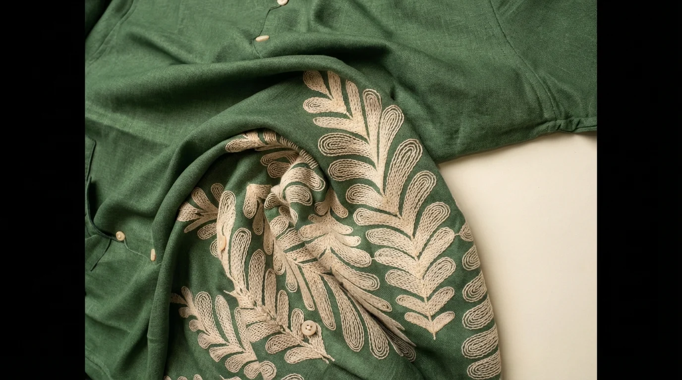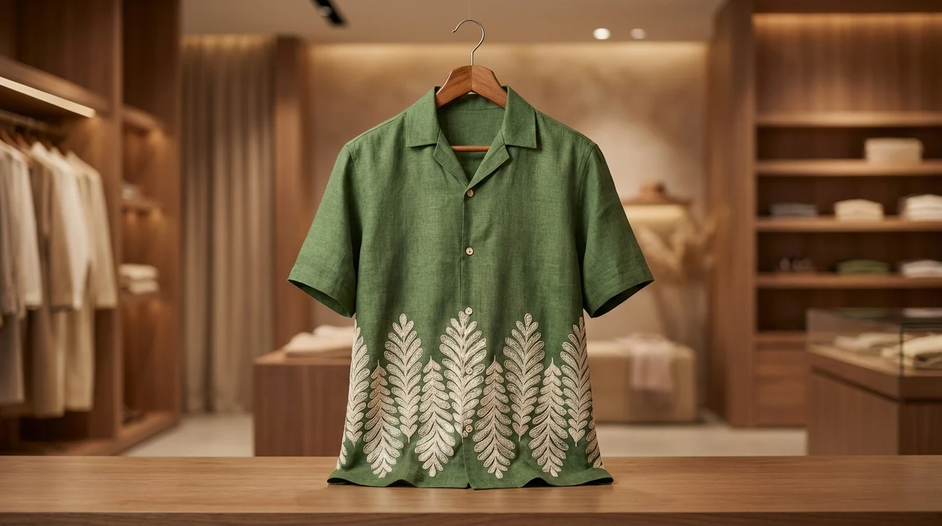 Redefine your summer wardrobe with this Sage Green Cuban collar shirt, a masterclass in understated luxury. Crafted from premium linen-blend fabric, the shirt features a rich, earthy olive tone that serves as the perfect canvas for its standout detail: intricate, cream-toned fern embroidery cascading across the lower half. The tactile nature of the embroidery adds a sophisticated depth to the garment, bridging the gap between artisanal craftsmanship and contemporary street style.