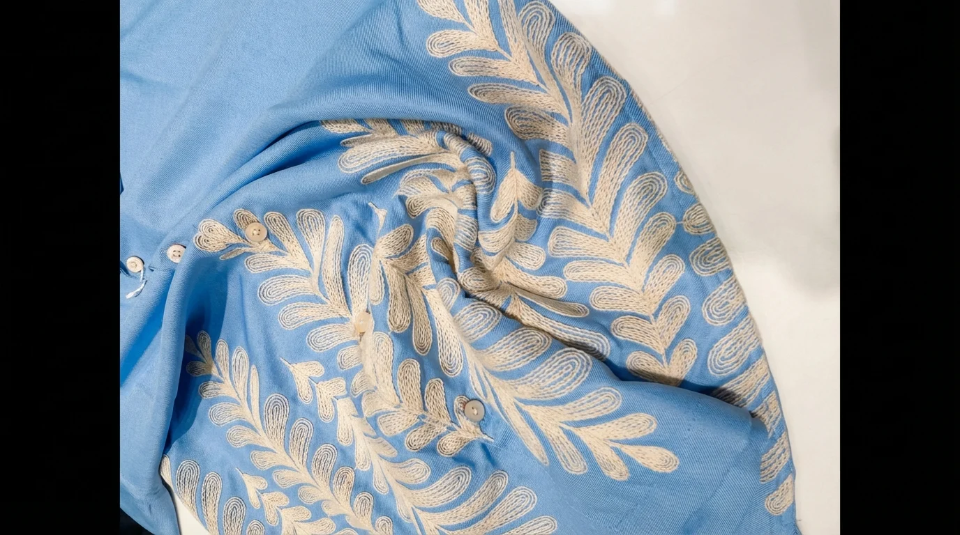 Artisanal Embroidery: Intricate ivory leaf motifs along the hem for a premium, textured finish.