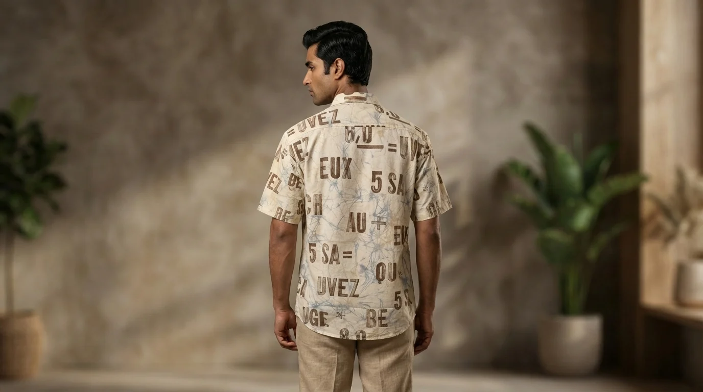 Redefine your casual wardrobe with this statement piece that blends contemporary street aesthetics with a vintage, artistic edge. The shirt features an intricate, all-over typography print in a weathered brown hue, set against a subtly textured off-white base with faint blue marble-like veining. The design evokes a sense of curated chaos, perfect for the modern man who values unique, conversational fashion.