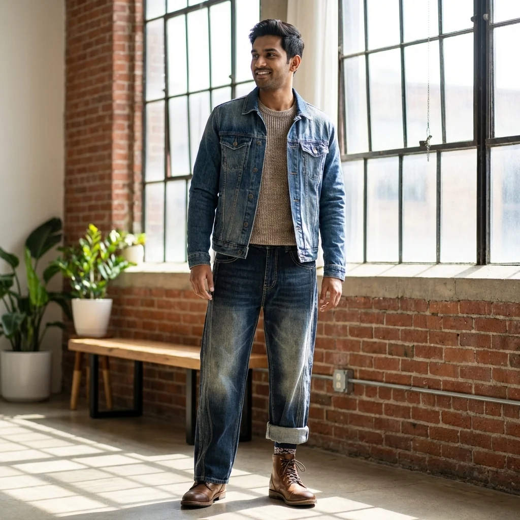 Premium Raw Denim Texture: Features a rugged, high-quality indigo base with strategic vintage fading for an authentic lived-in look.